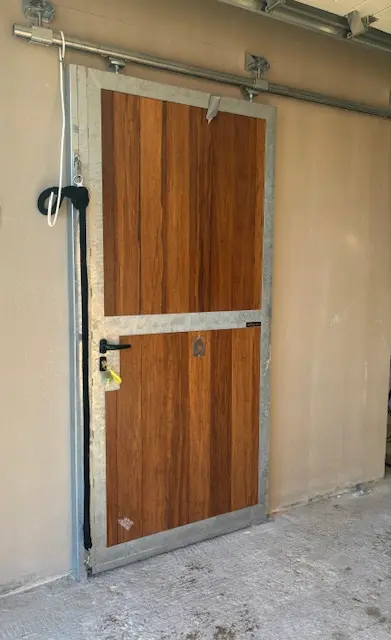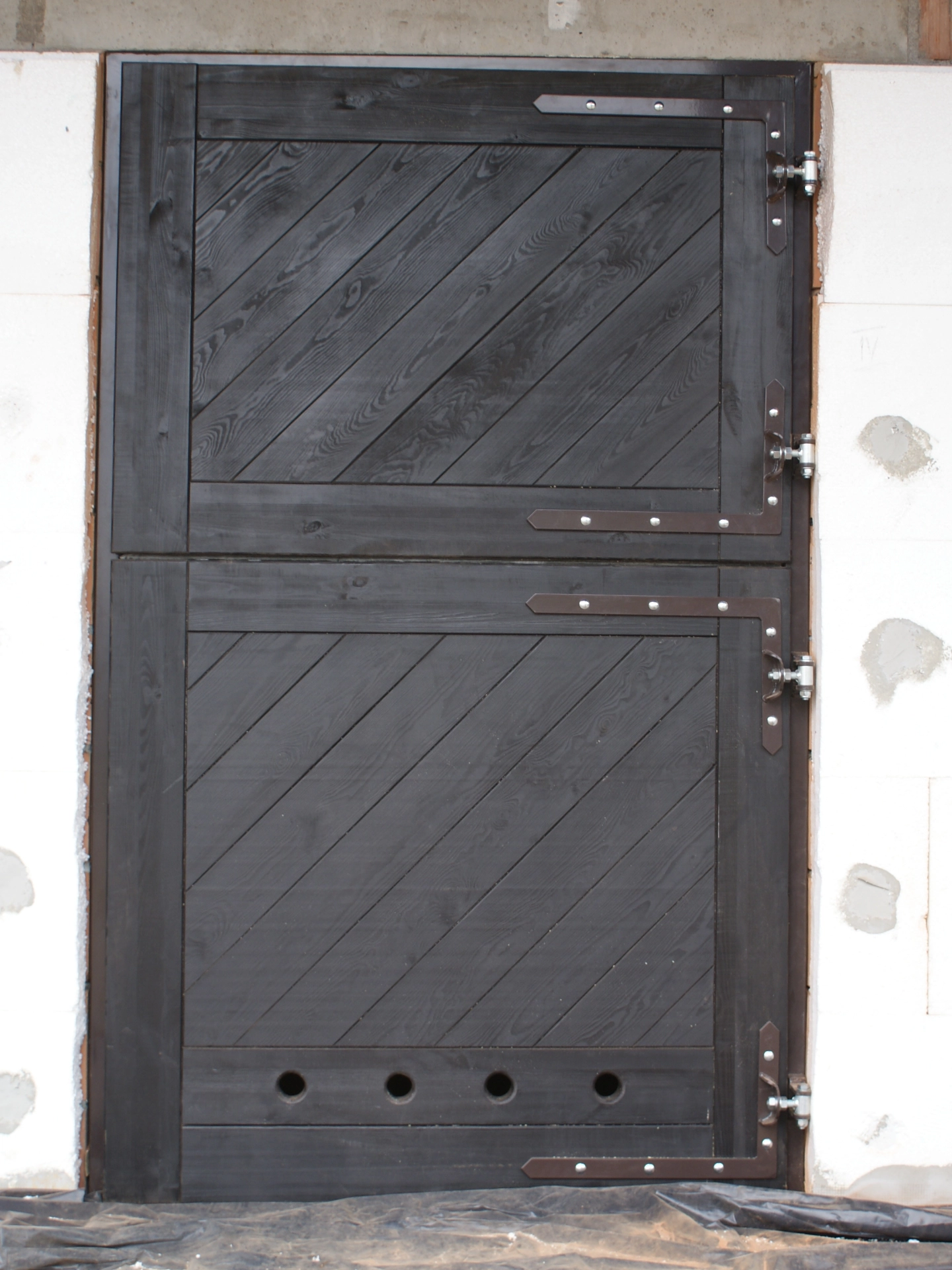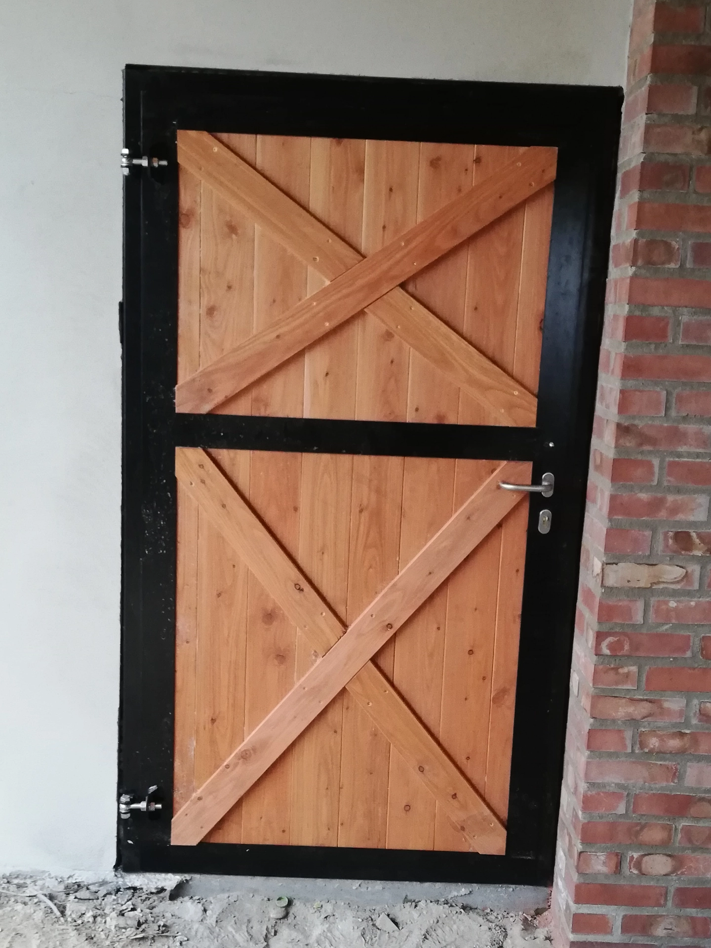 Te drzwi stajenne łączą wytrzymałą, stalową ramę z drewnianym wypełnieniem, co zapewnia trwałość i estetykę. Podzielone na dwie części dla wygodniejszego użytkowania, posiadają solidne okucia oraz zabezpieczenia przed korozją.