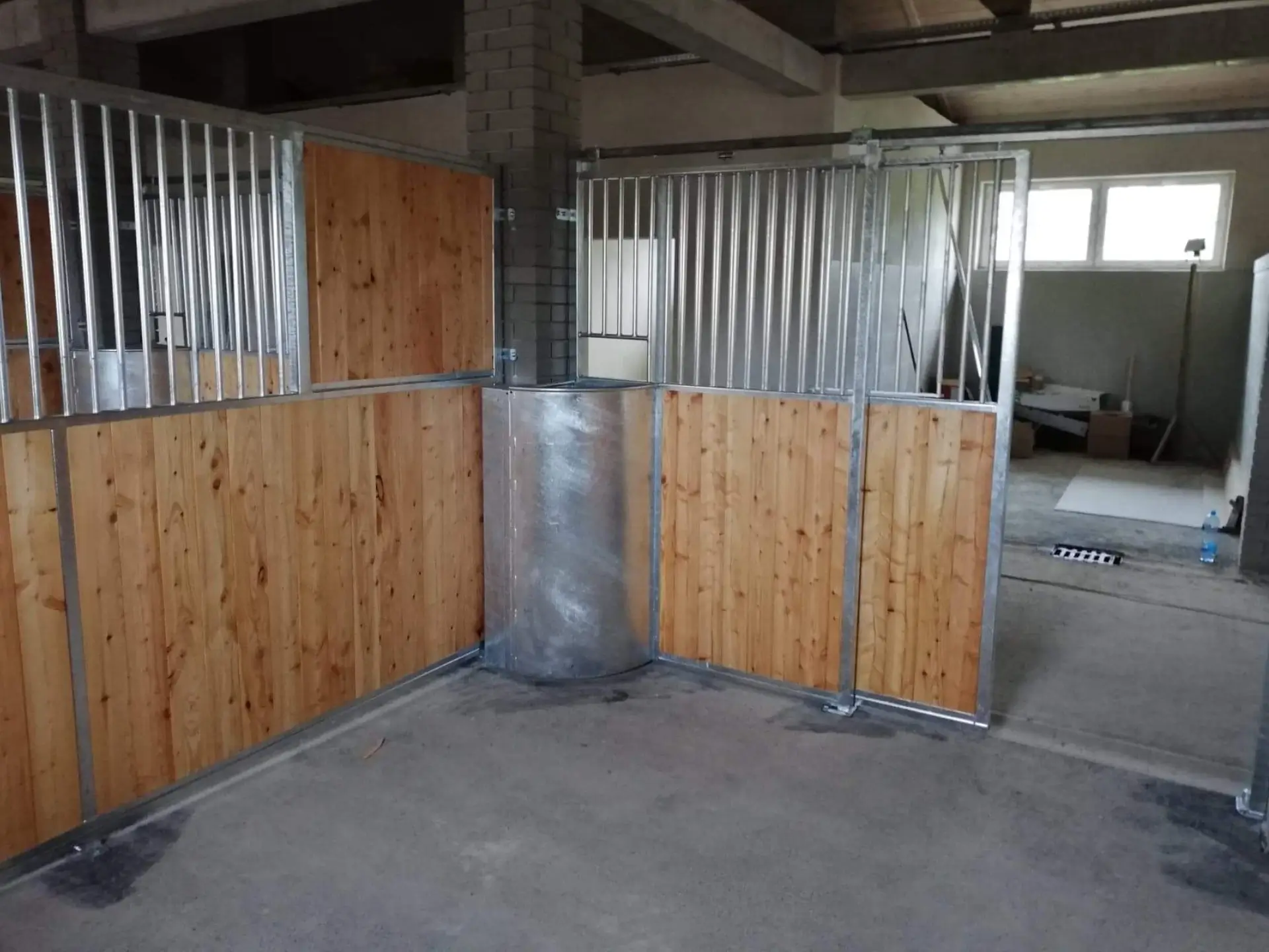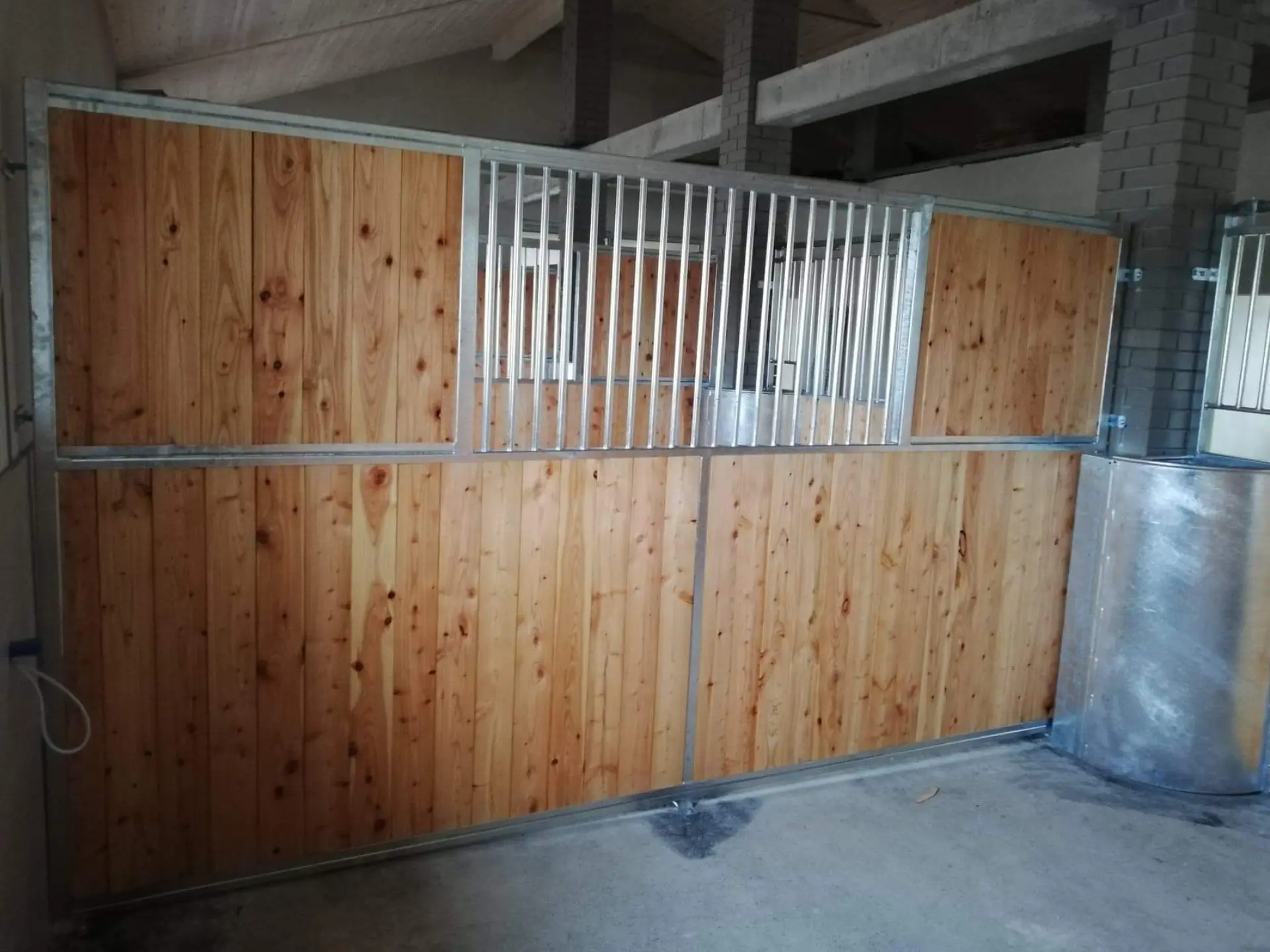 Ściana działowa SD.40 to przegroda boksu zbudowana z solidnej dolnej części, gwarantującej prywatność, oraz mniejszej górnej sekcji z pionowymi stalowymi rurkami, co umożliwia dobrą wentylację oraz bezpieczny kontakt wzrokowy między końmi. Taki układ łączy w sobie funkcjonalność, wytrzymałość i estetykę, tworząc komfortowe warunki dla zwierząt, a jednocześnie łatwość konserwacji dla właściciela stajni.
