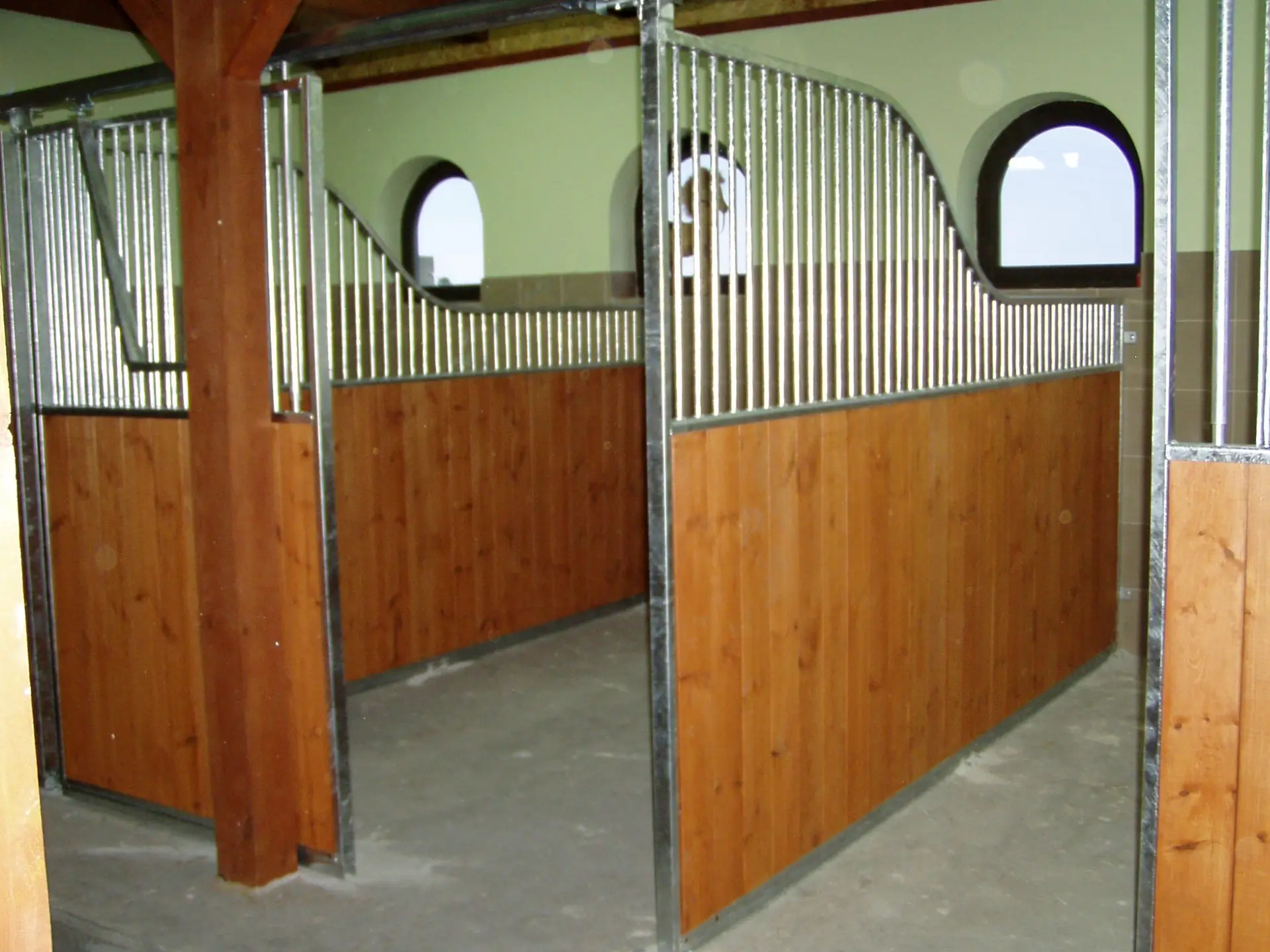 Ściana działowa SD.70 wyróżnia się opadającą linią górnej części, co nadaje jej unikalny i dynamiczny wygląd. Górna część wykonana jest z pionowych rurek stalowych, co zapewnia lepszą wentylację i widoczność między boksami. Dolna część ściany jest solidna i zbudowana z wytrzymałych desek, co zapewnia prywatność oraz izolację od sąsiednich boksów.