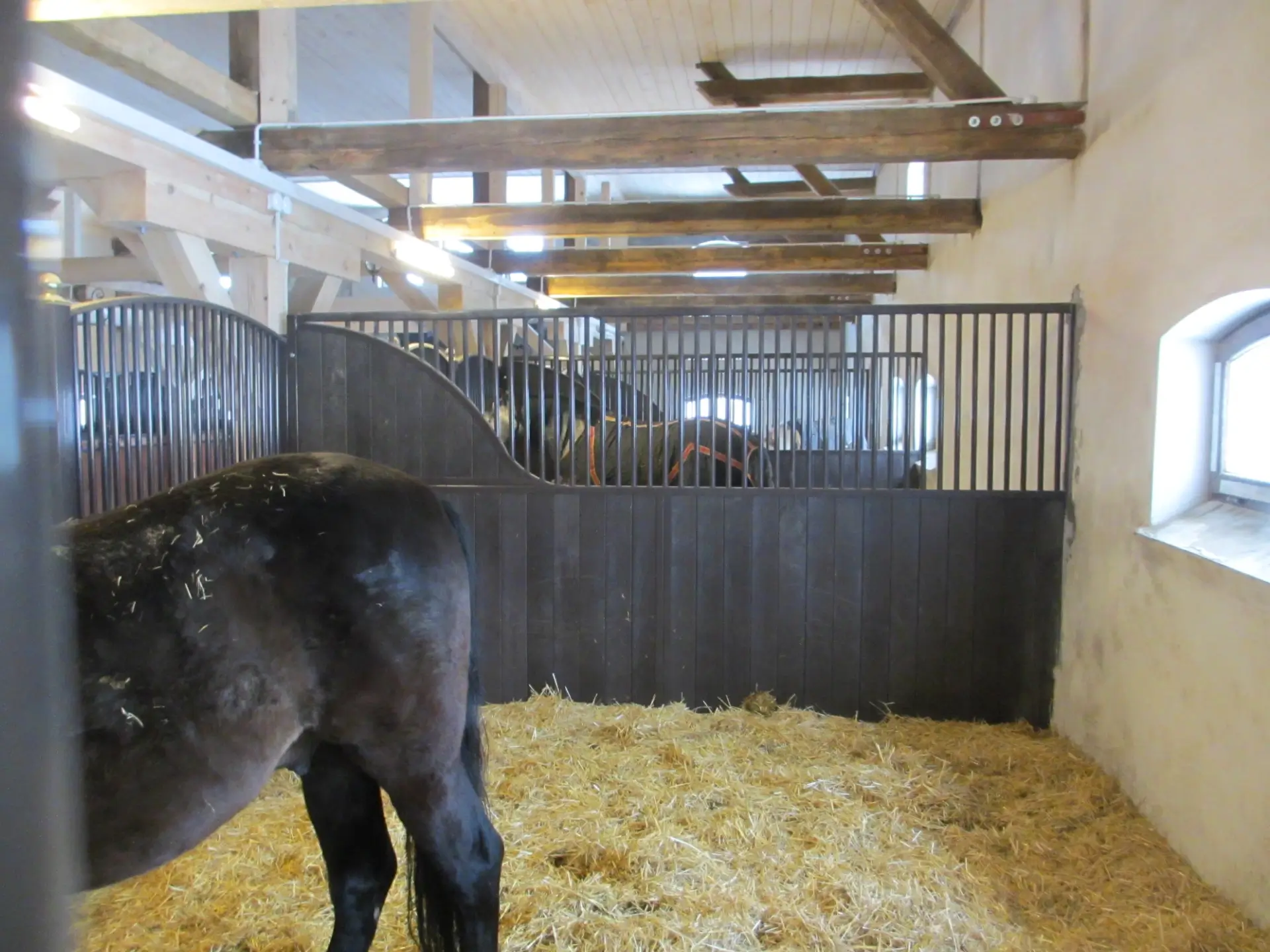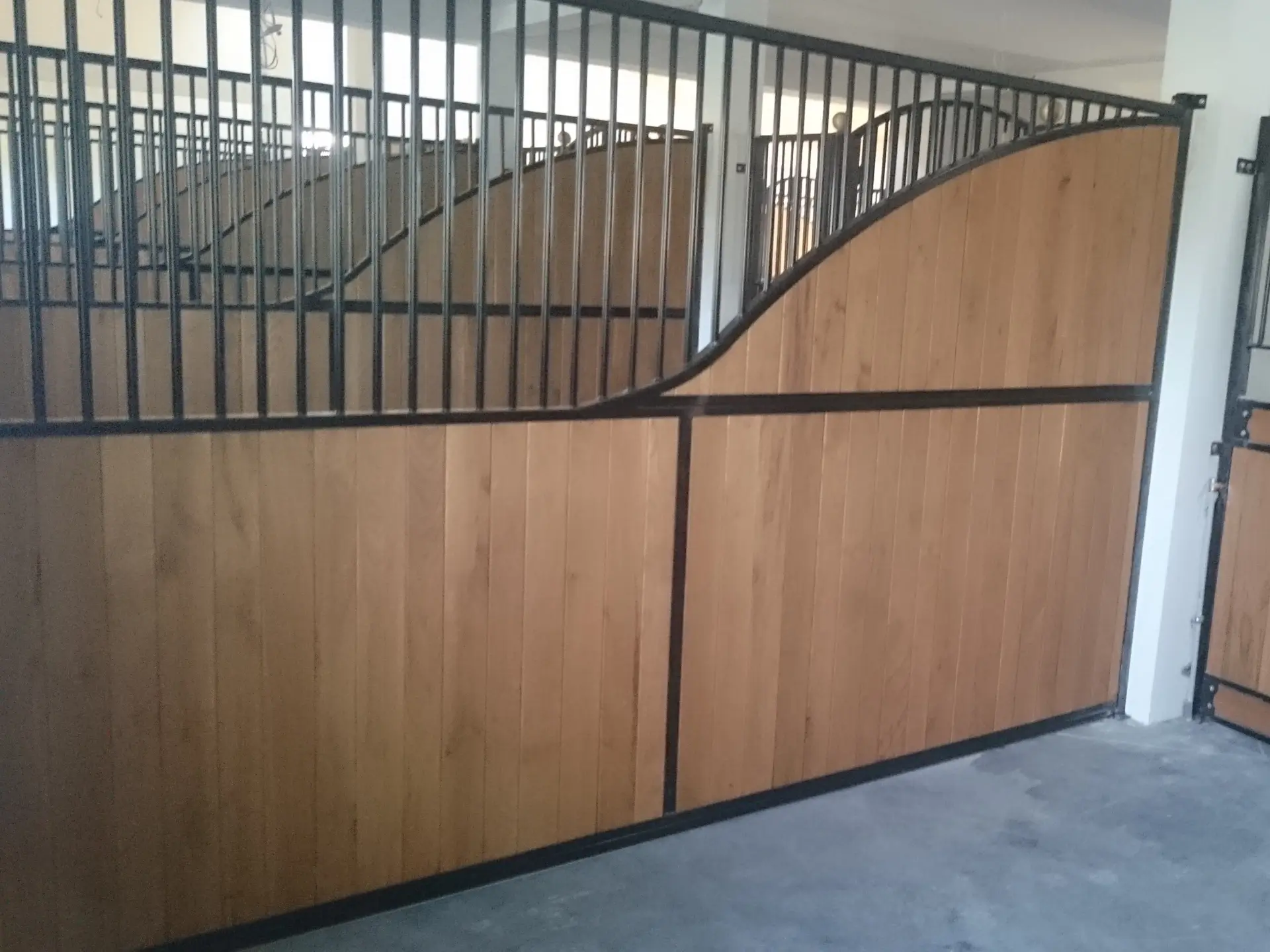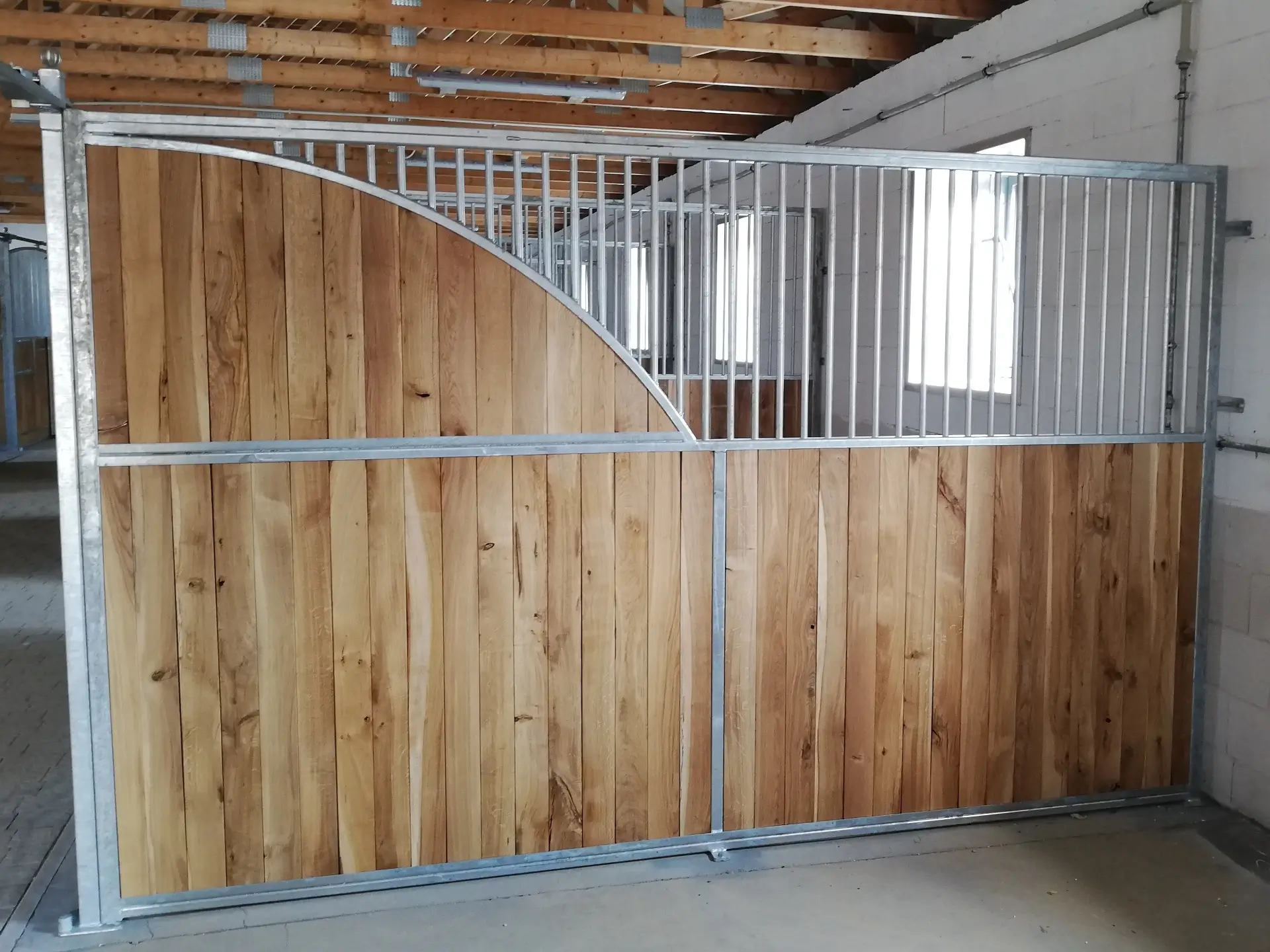 Ściana działowa SD.80 charakteryzuje się nietypowym, opadającym kształtem górnej części, która łączy stalowe rurki z deskami. Górna część zapewnia doskonałą wentylację i widoczność między boksami, co może sprzyjać lepszej cyrkulacji powietrza i utrzymaniu kontaktu między końmi. Dolna, pełna część ściany zapewnia prywatność i solidną barierę.