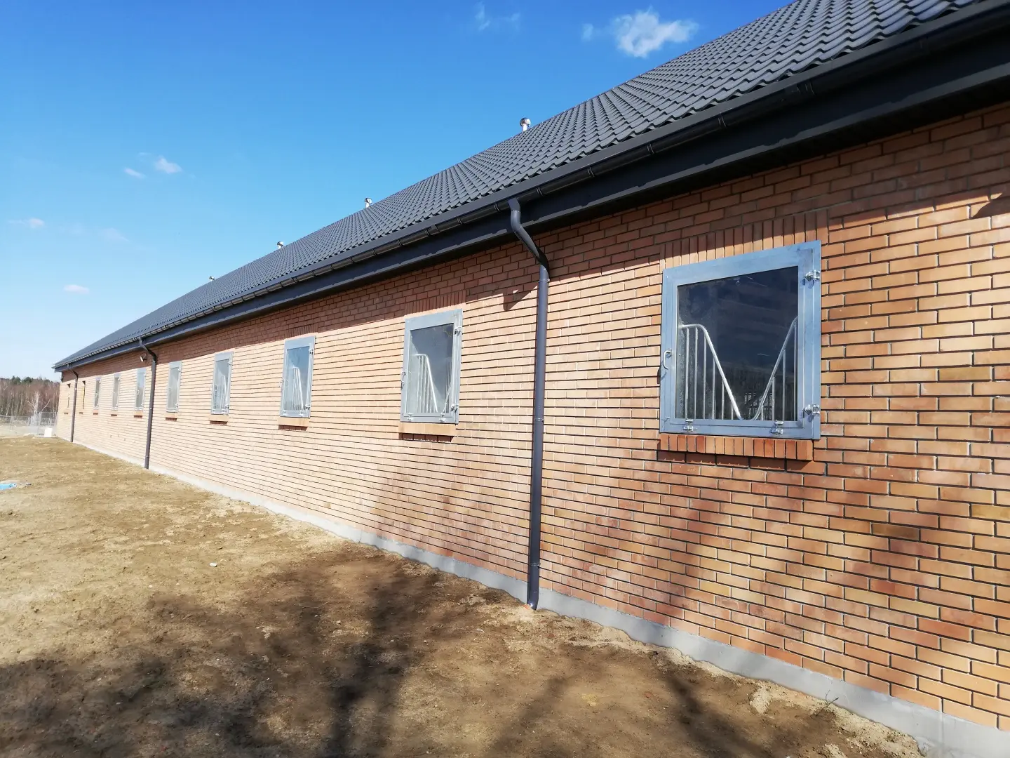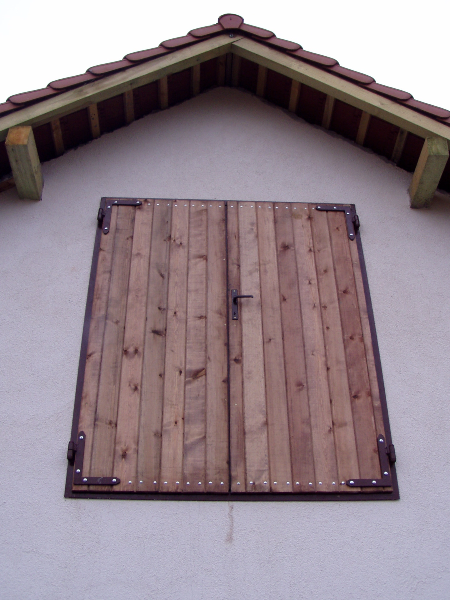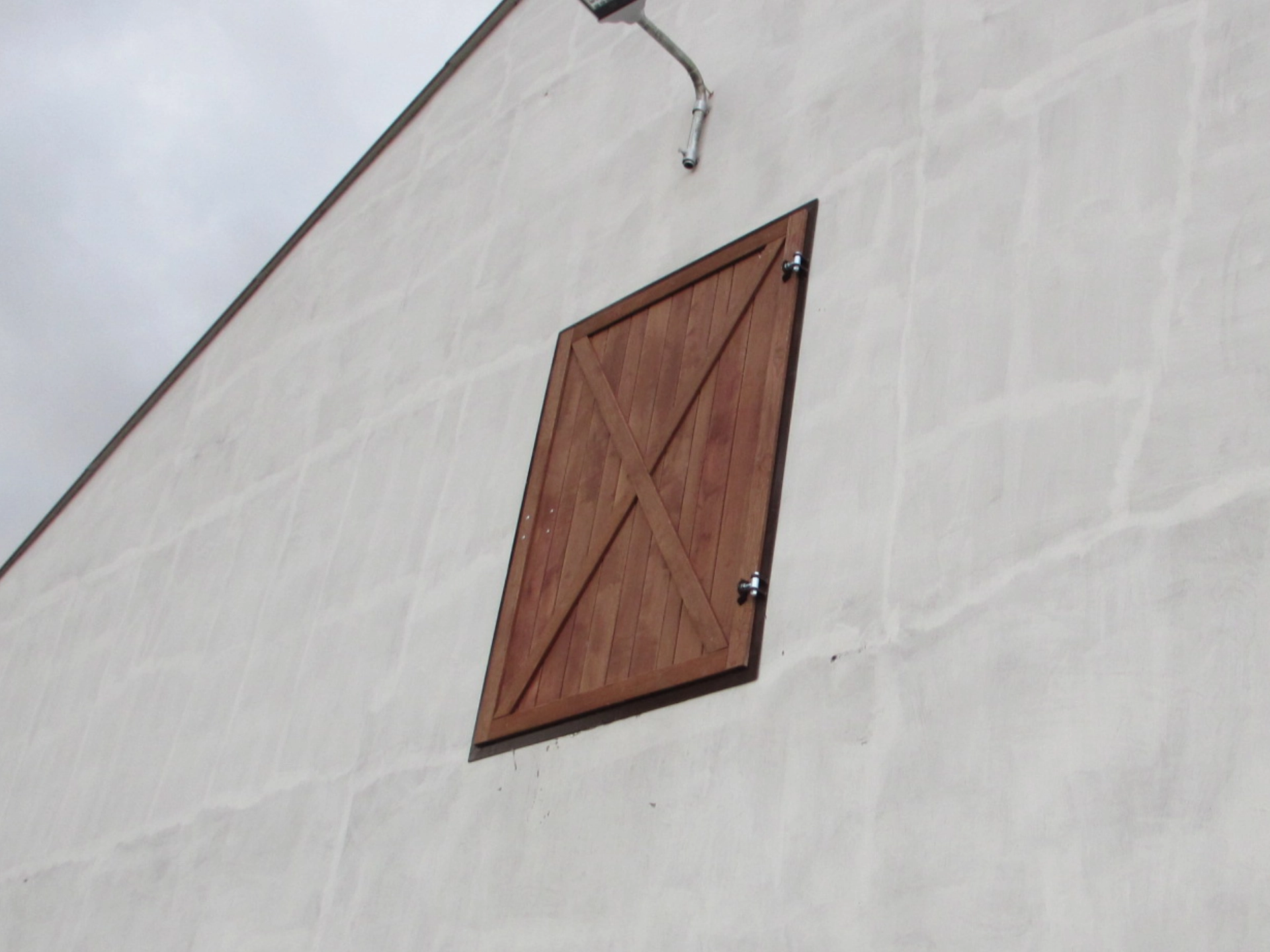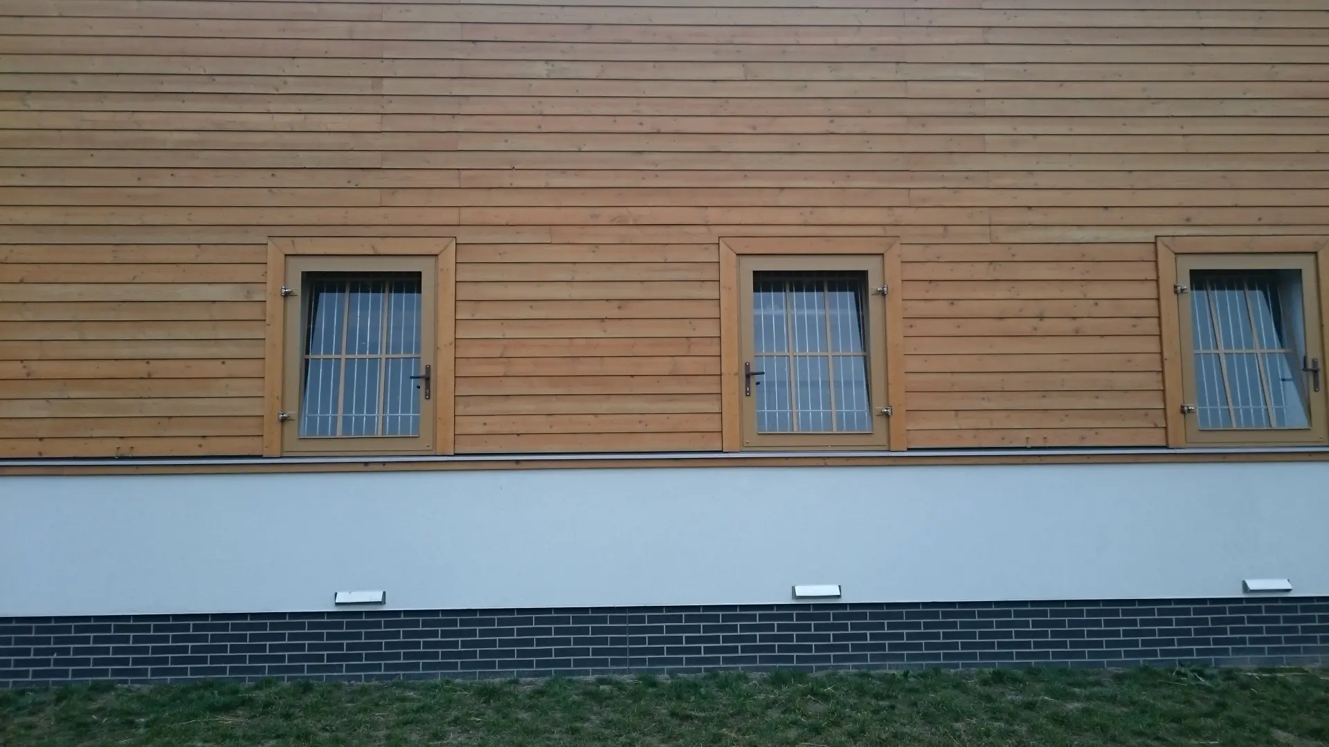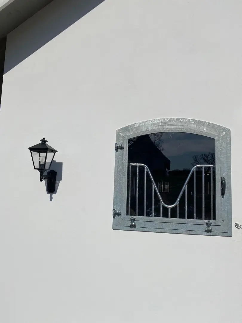 Okno otwierano-uchylne na zewnątrz, szyba bezpieczna, krata w kształcie litery „V”, konstrukcja metalowa ocynkowana.