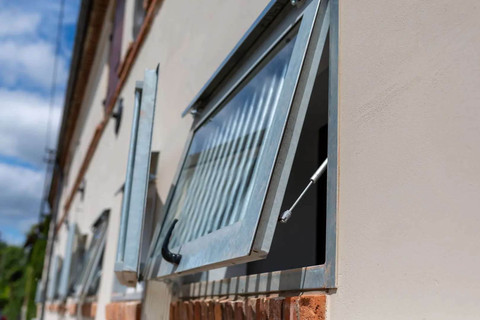 Okno uchylne na zewnątrz, szyba bezpieczna, krata, konstrukcja metalowa ocynkowana.