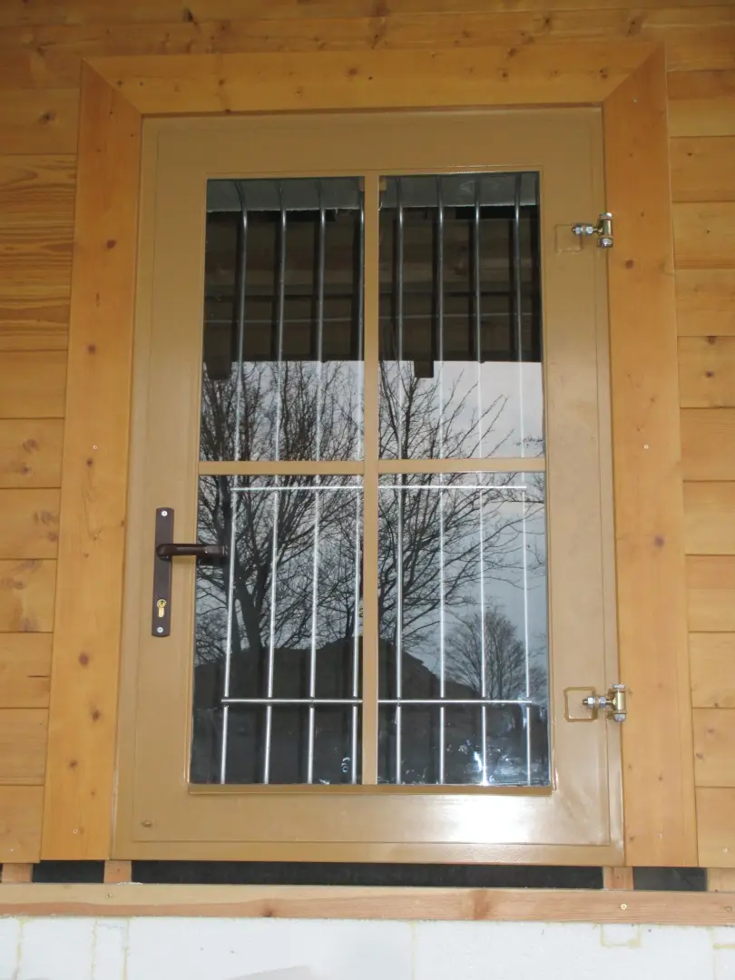 Okno otwierano-uchylne na zewnątrz, szyba bezpieczna, krata, konstrukcja metalowa ocynkowana i pomalowana proszkowo.