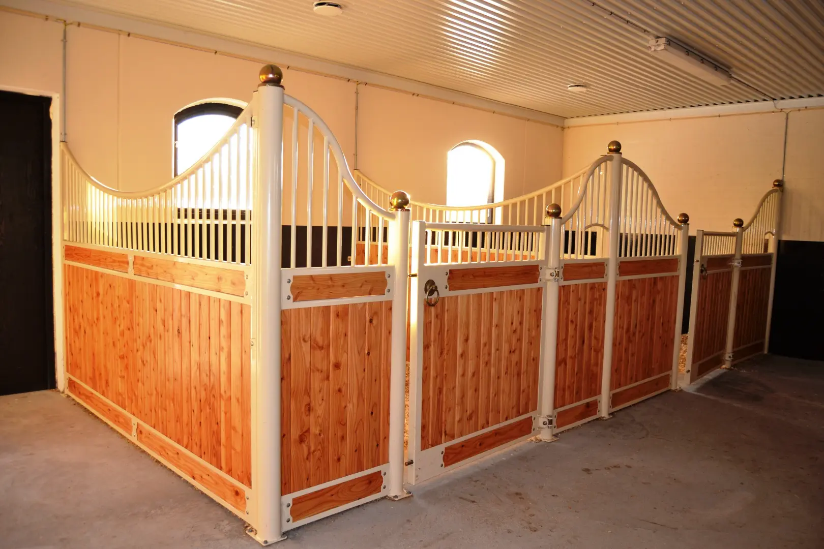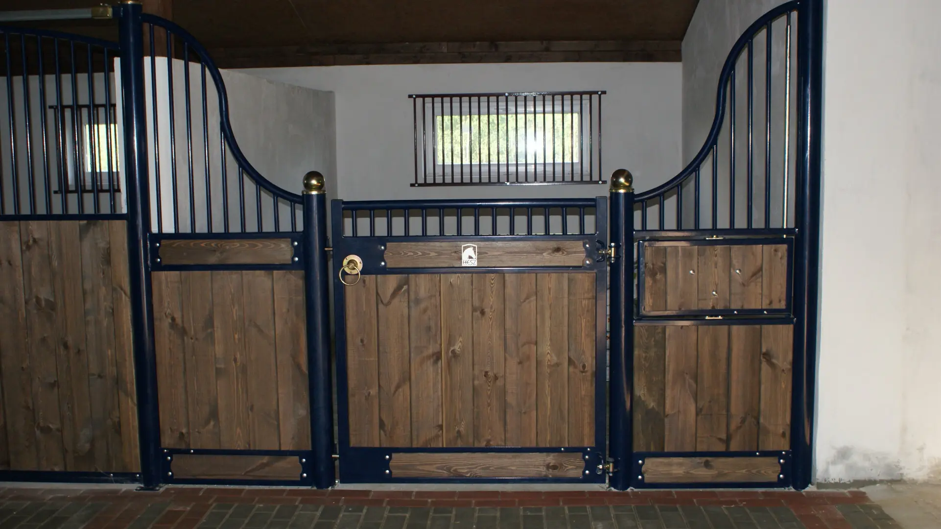 Deski sosnowe malowane, kule ozdobne ze stali nierdzewnej pomalowane na złoty kolor, konstrukcja metalowa ocynkowana i pomalowana proszkowo, dodatkowo ramka obrotowa koryta.