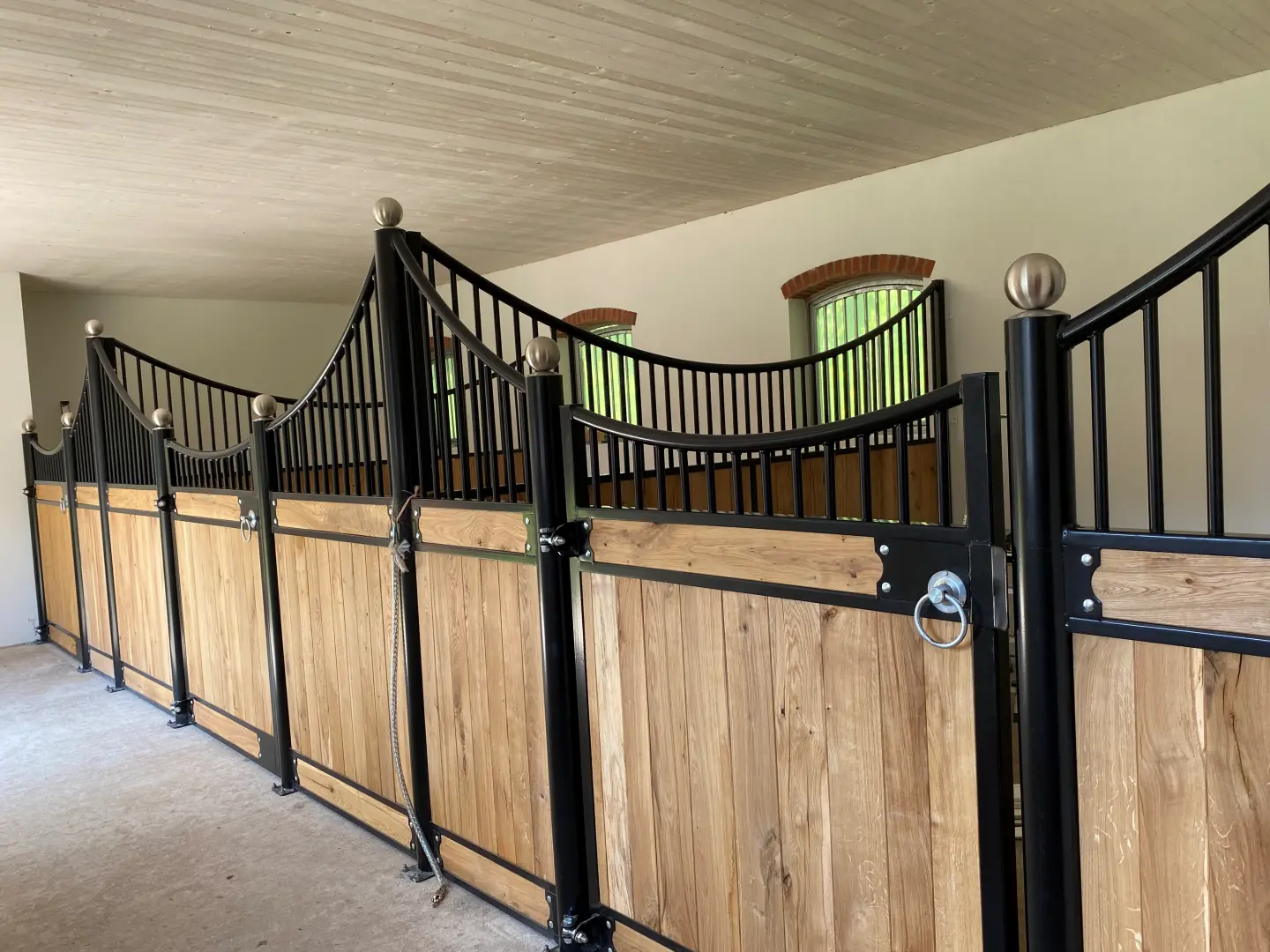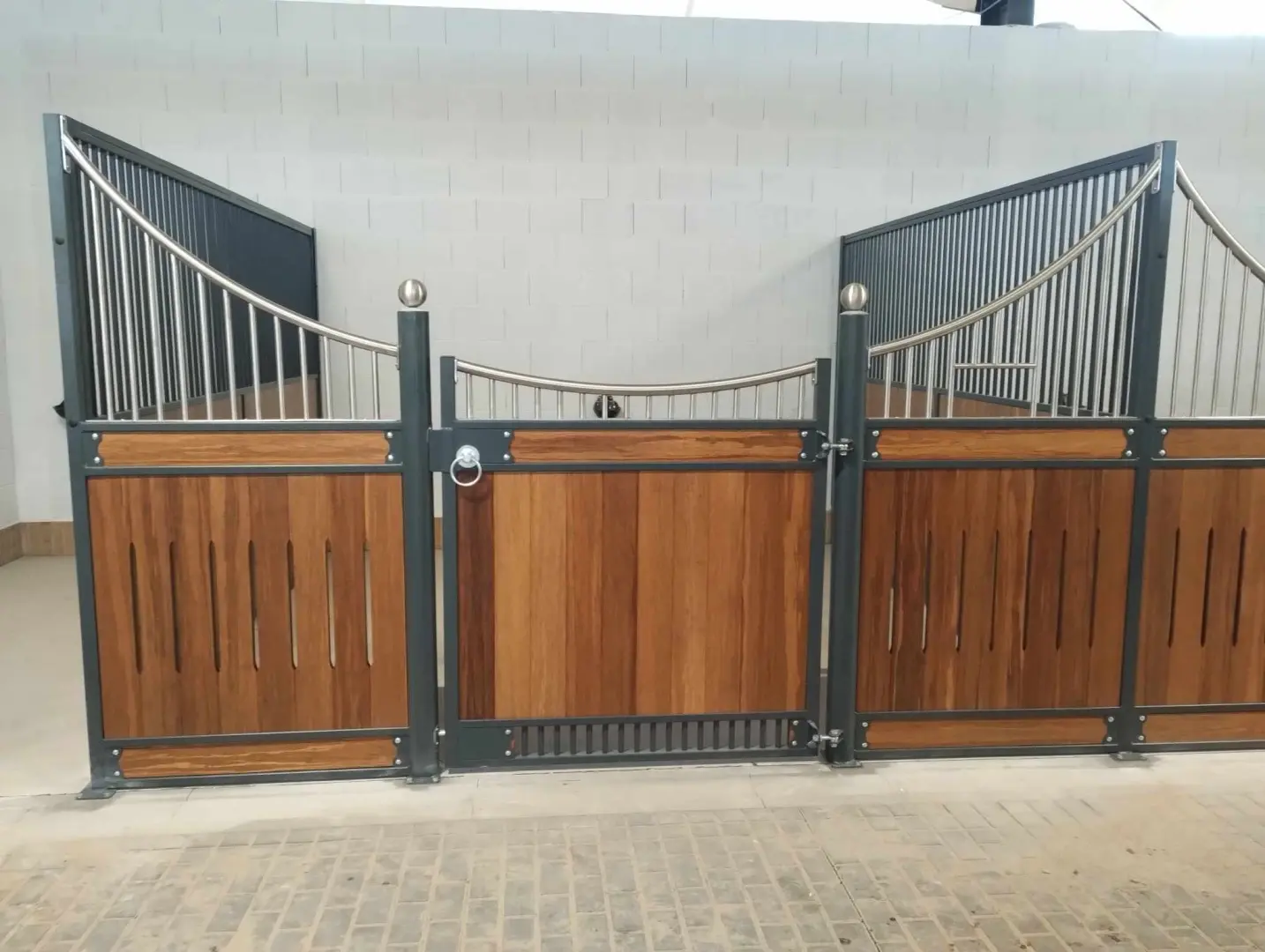 Deski dębowe zaimpregnowane, kule ozdobne ze stali nierdzewnej, konstrukcja metalowa ocynkowana.