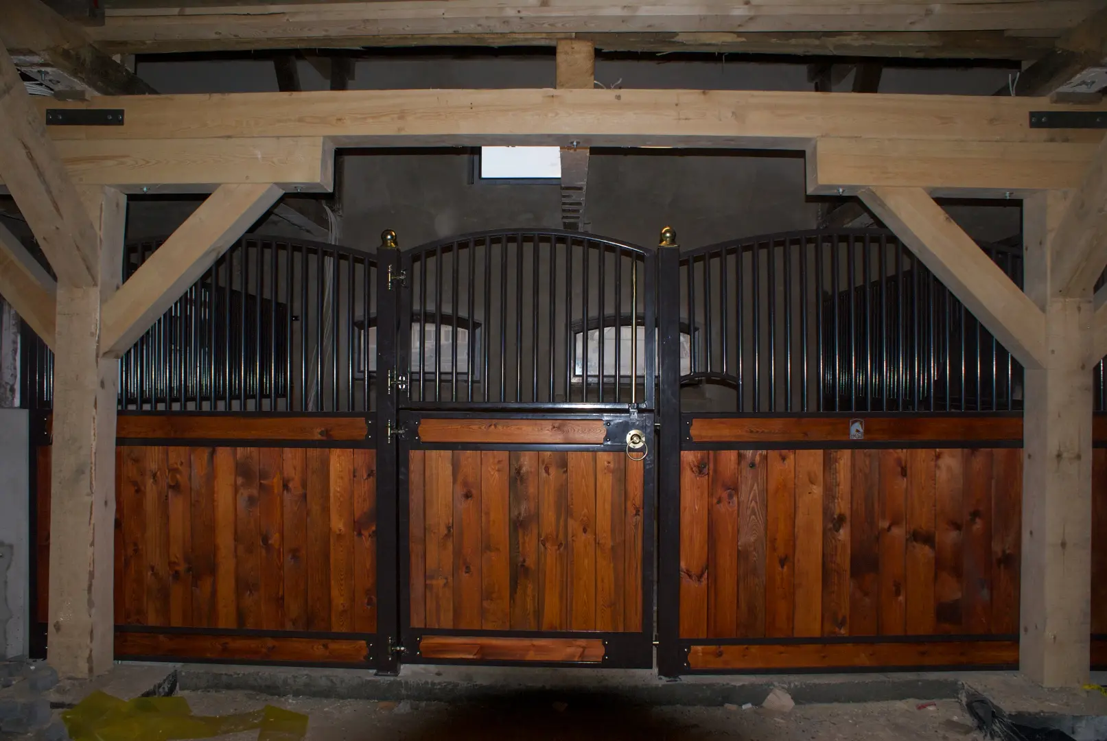 Deski dębowe opalane, kule ozdobne ze stali nierdzewnej, konstrukcja metalowa ocynkowana i pomalowana proszkowo.