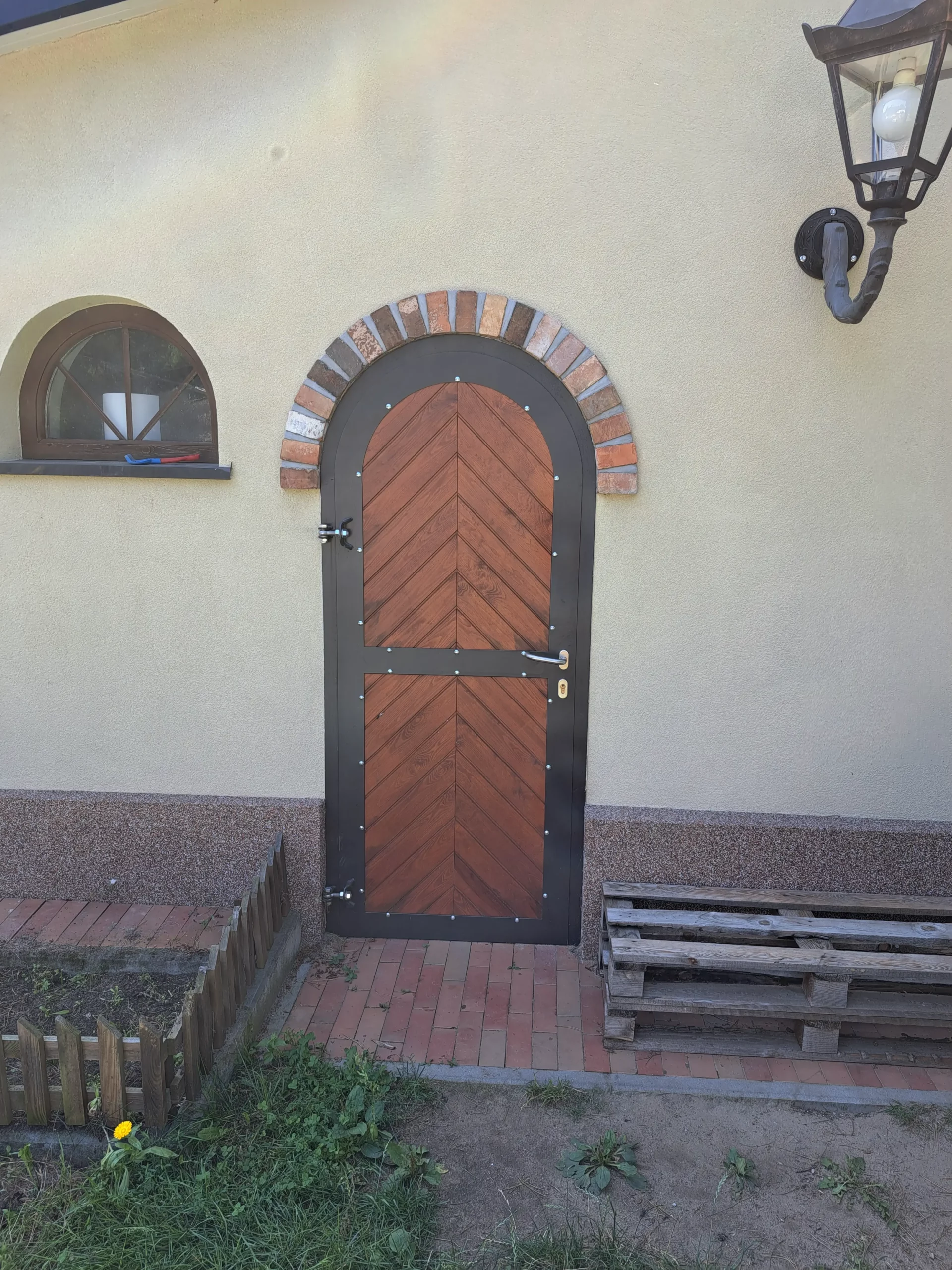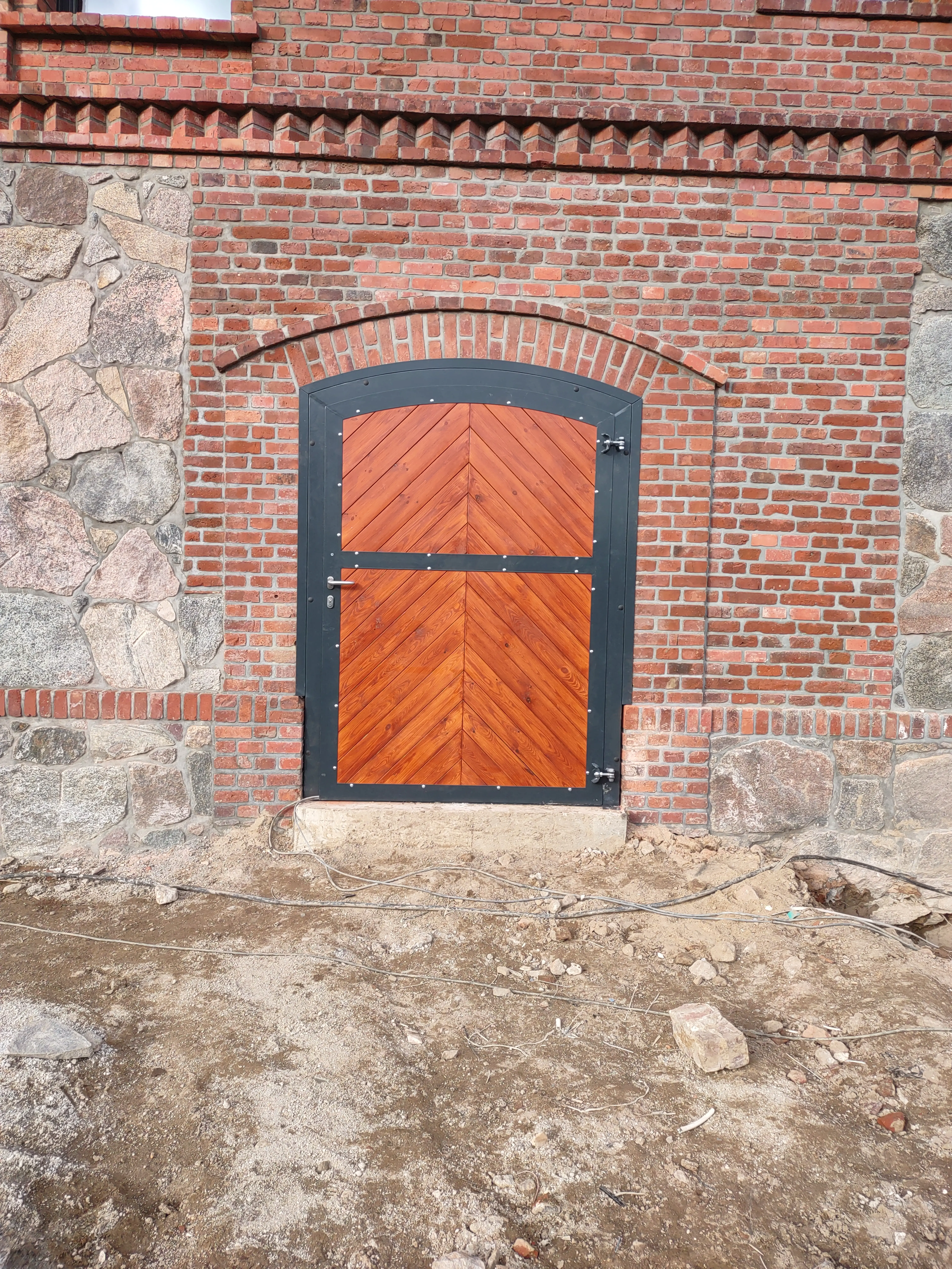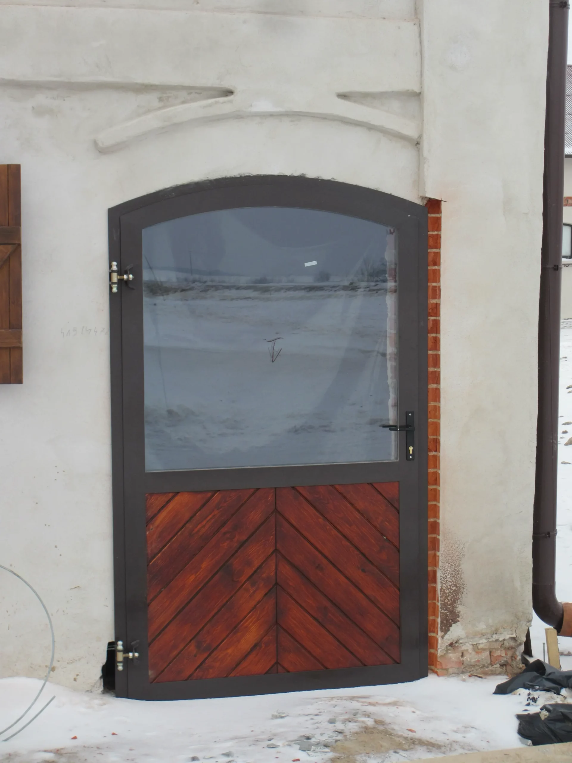 Drzwi jednoczęściowe z łukiem, deski sosnowe malowane ułożone w jodełkę, konstrukcja metalowa ocynkowana i malowana proszkowo.
