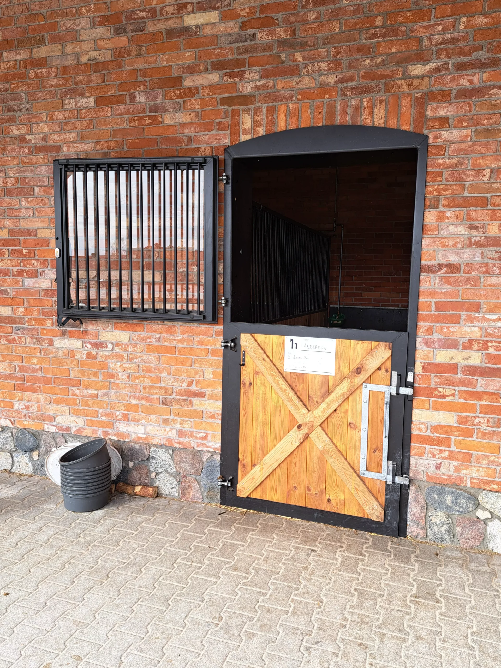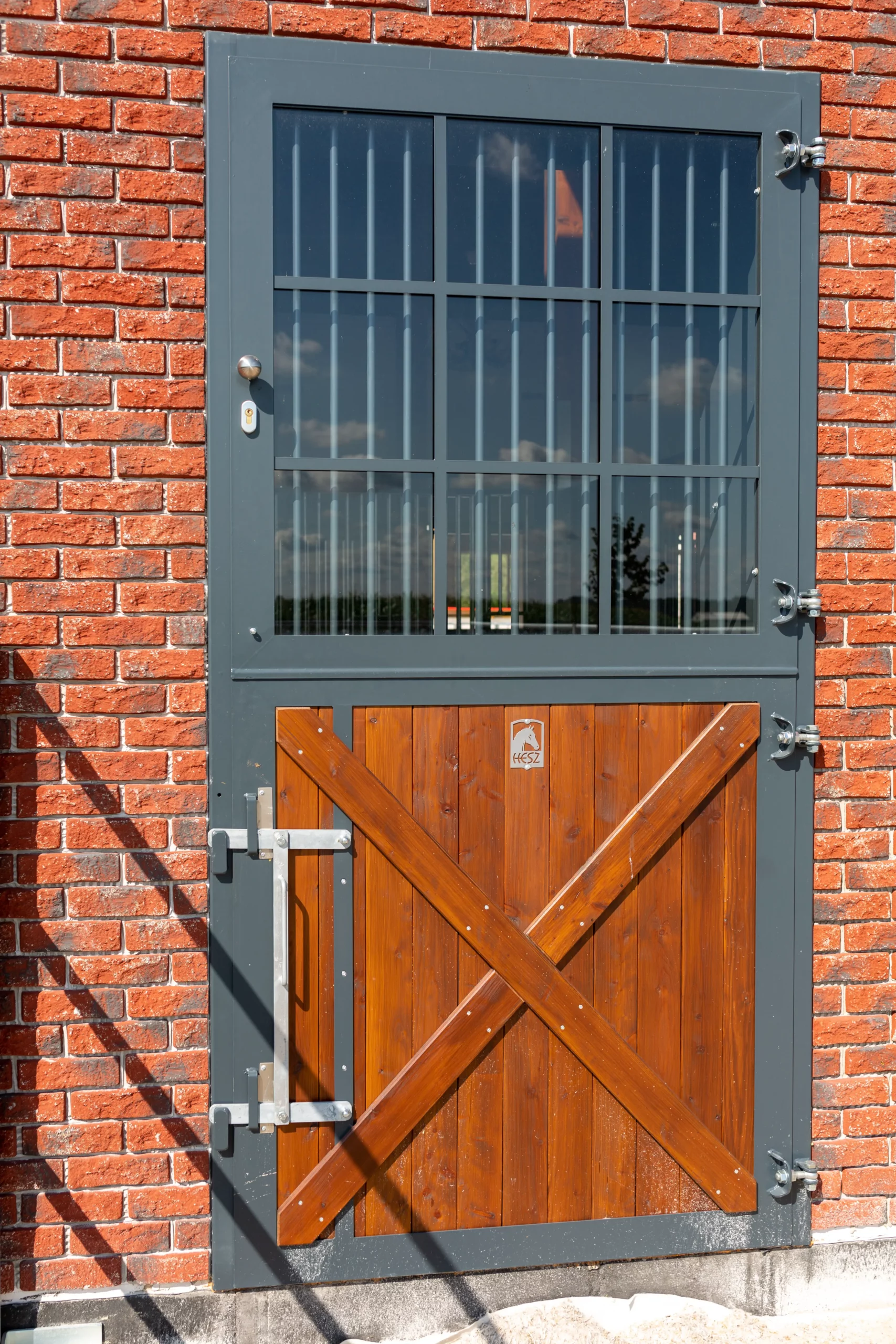 Drzwi dwuczęściowe, deski sosnowe malowane, u góry szyba bezpieczna, szprosy i krata, konstrukcja metalowa ocynkowana i malowana proszkowo.