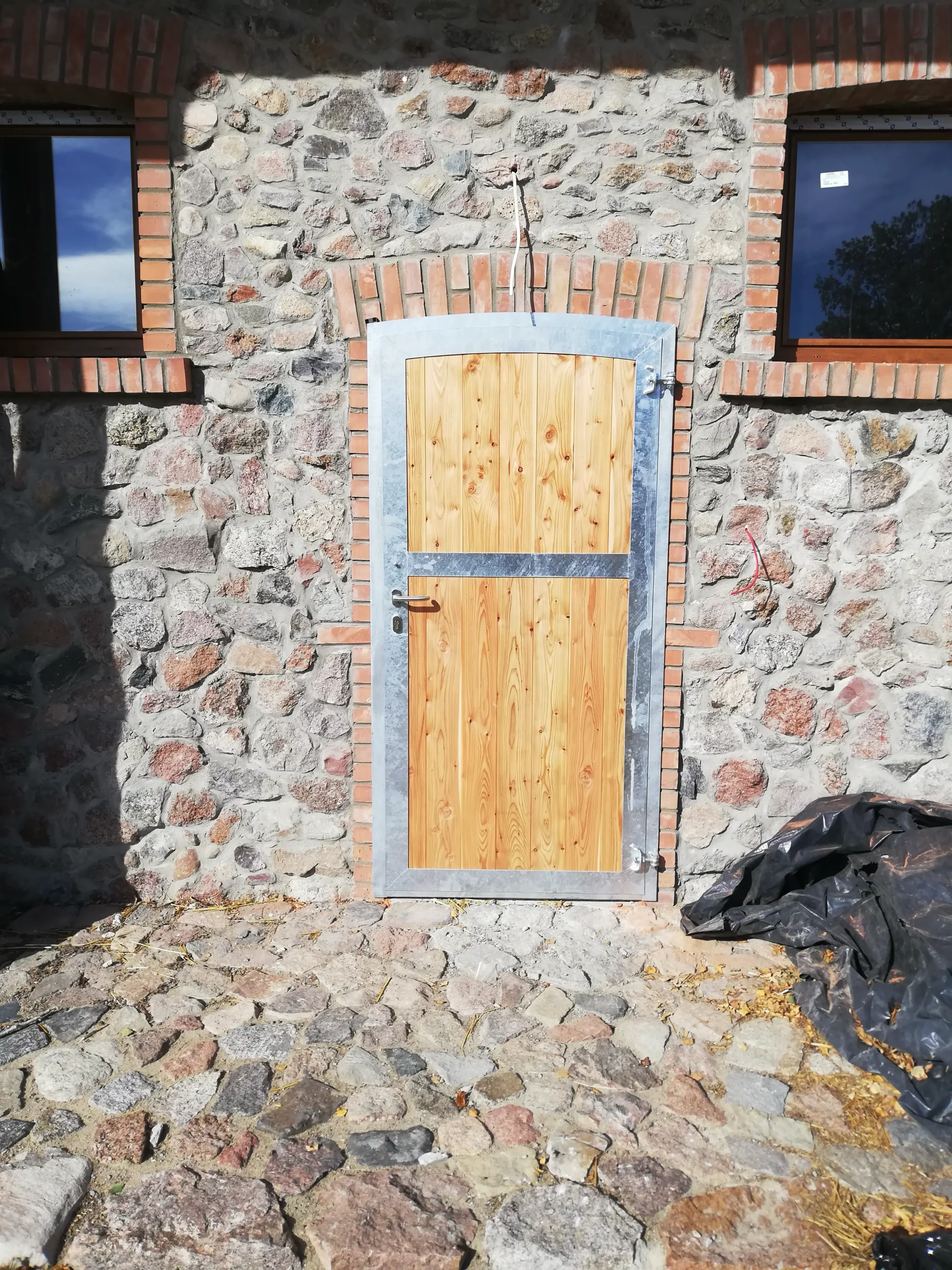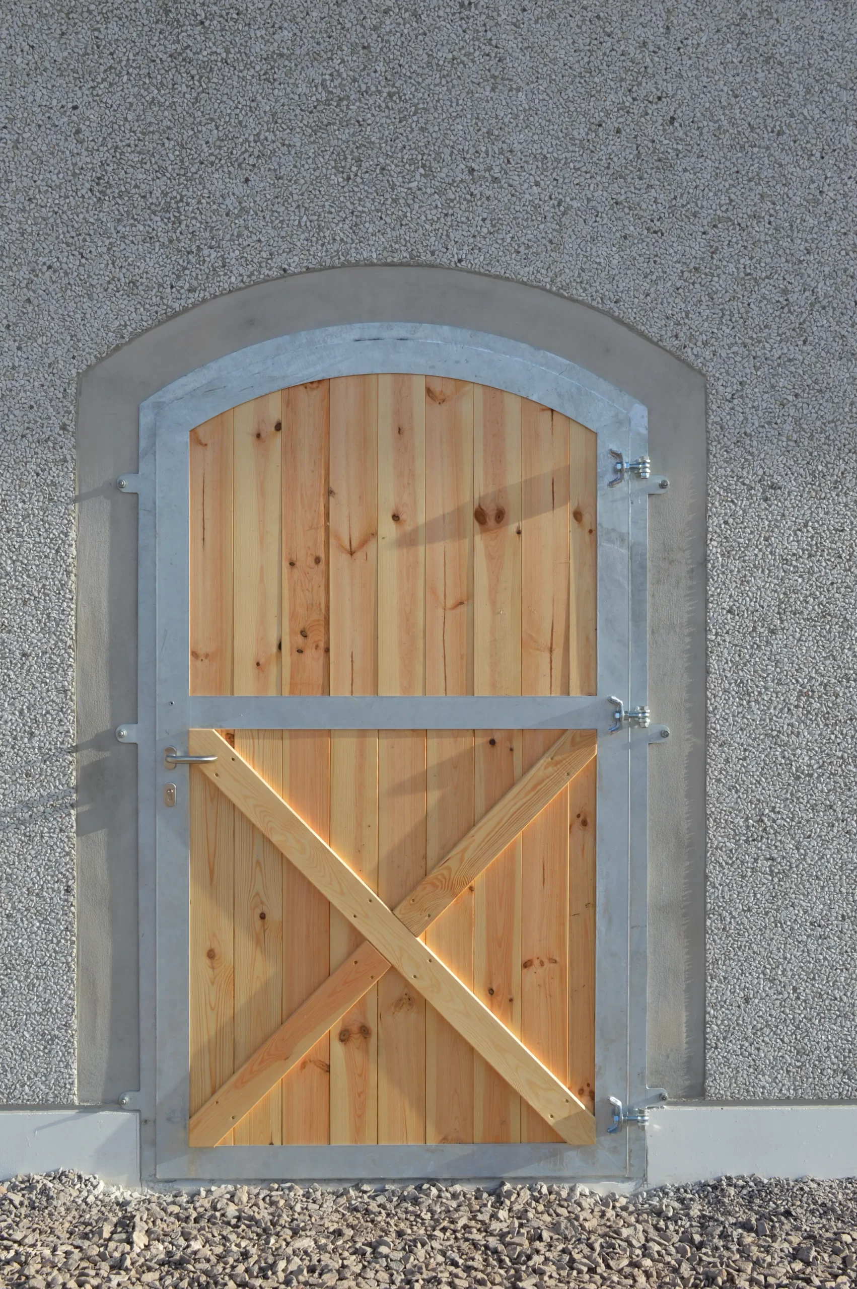Drzwi jednoczęściowe, deski sosnowe impregnowane, konstrukcja metalowa ocynkowana.