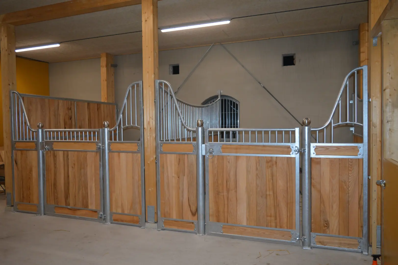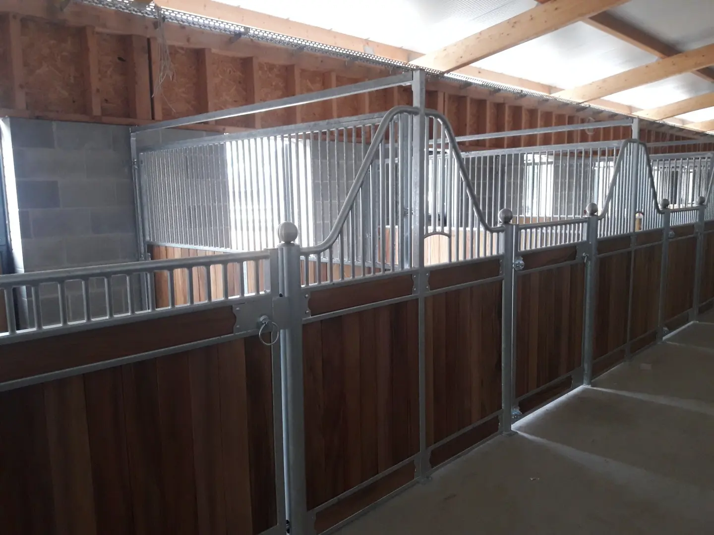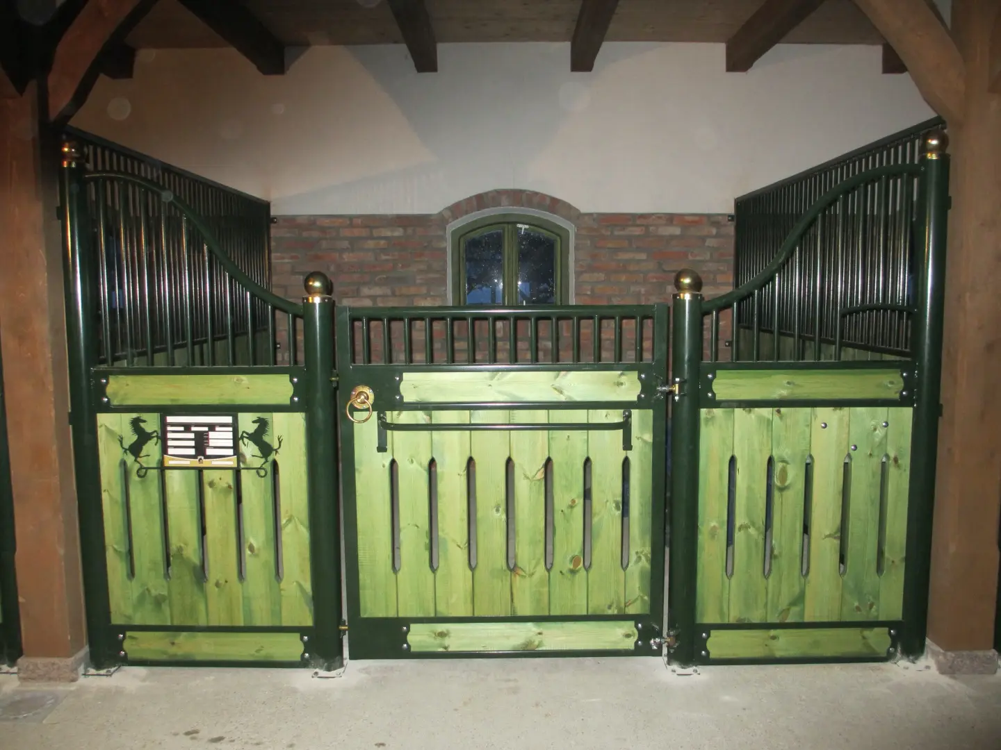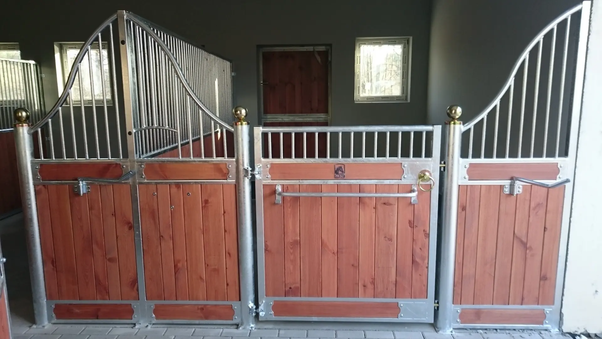 Deski sosnowe malowane, kule ozdobne ze stali nierdzewnej pomalowane na złoty kolor, konstrukcja metalowa ocynkowana, dodatkowo zawieszka na siodło, zawieszka na derkę.