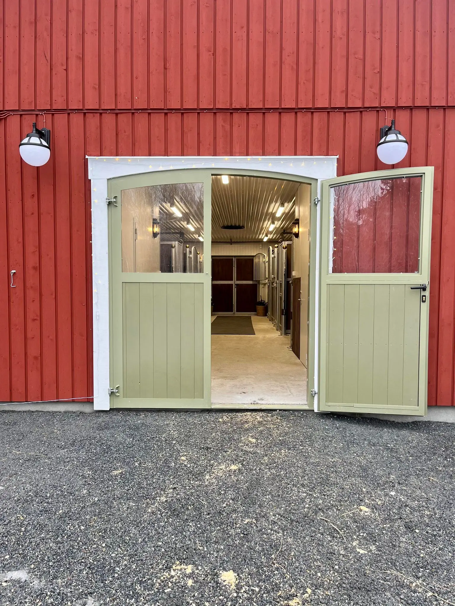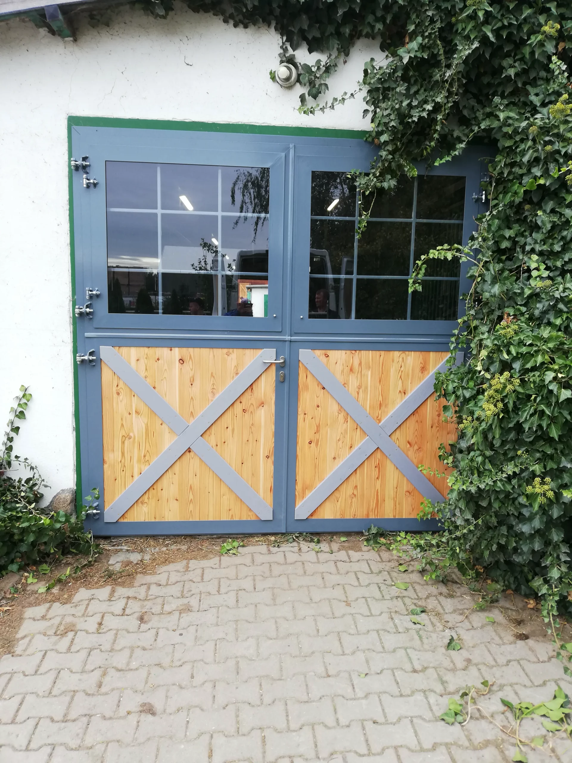 Drzwi dwuczęściowe, deski sosnowe malowane, konstrukcja metalowa ocynkowana i malowana proszkowo, dodatkowe „x” ozdobne.