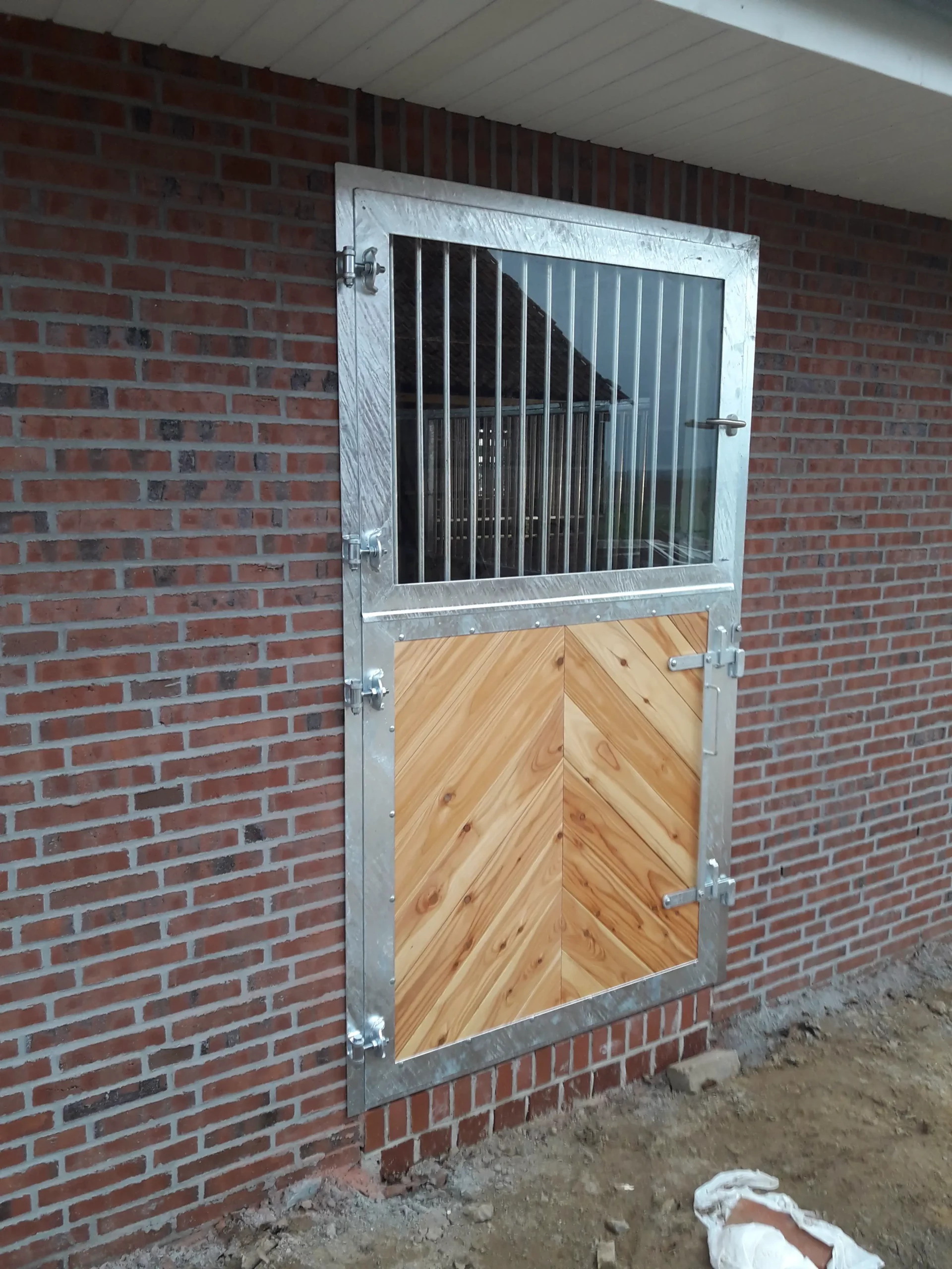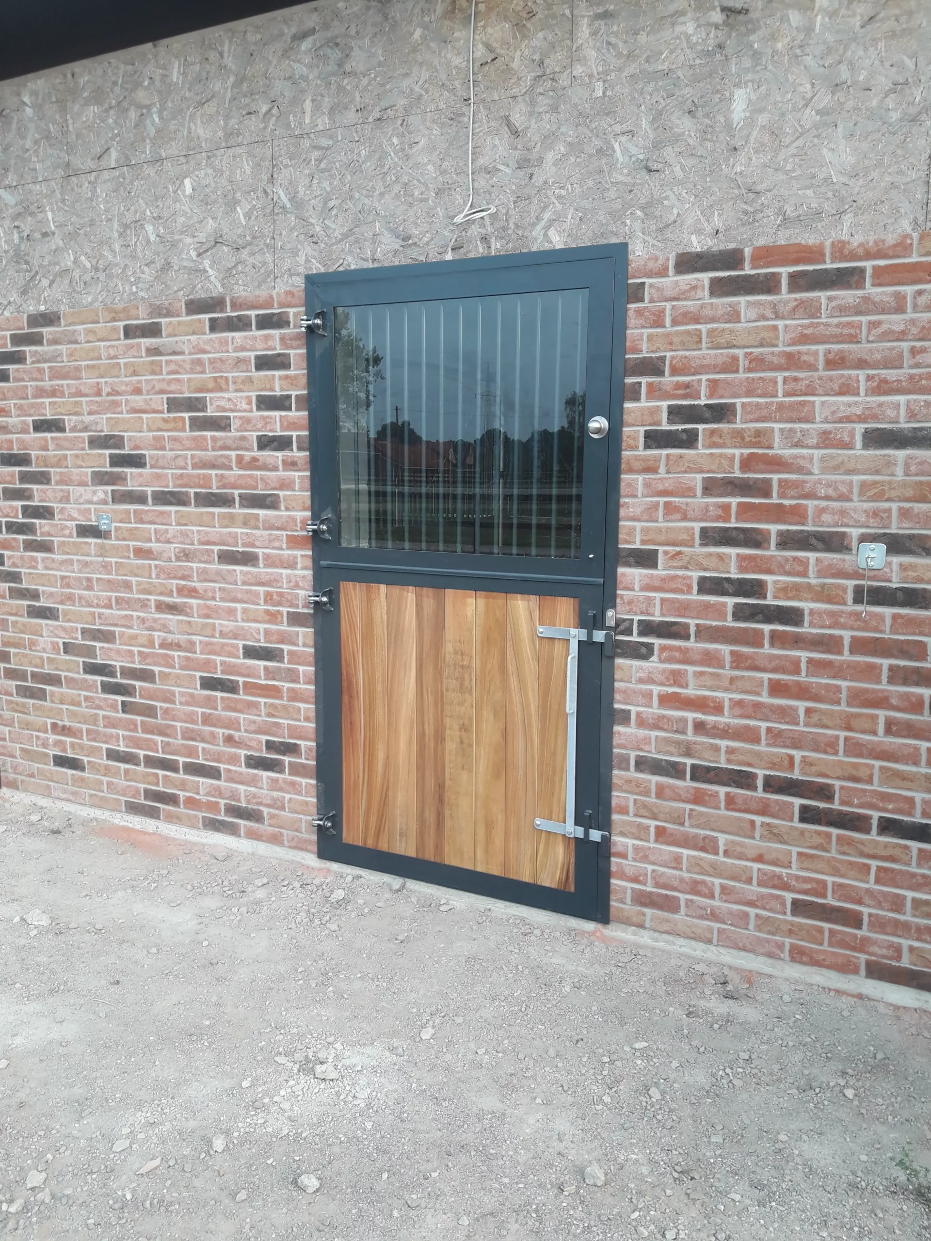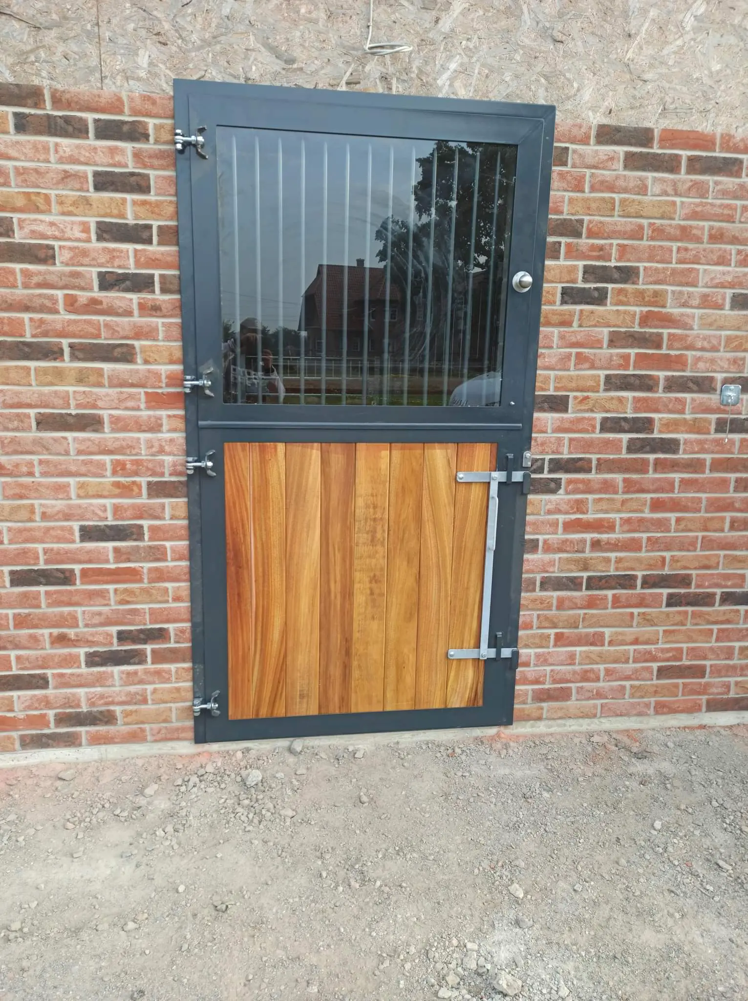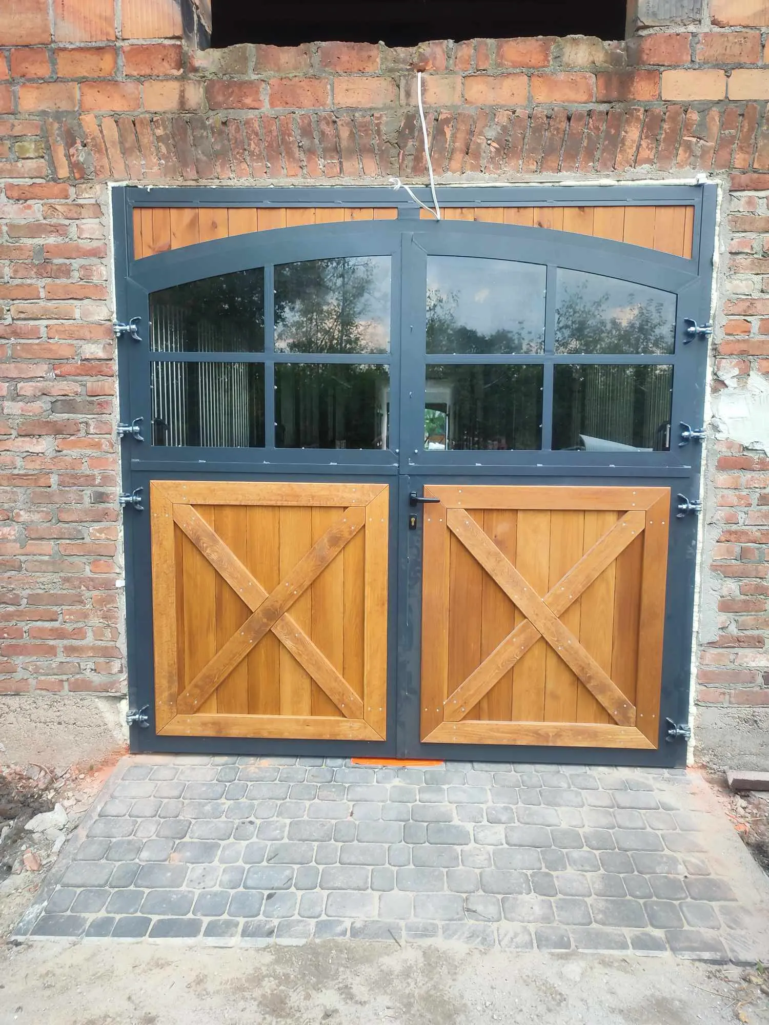 Drzwi dwuczęściowe, deski jesionowe zaimpregnowane, u góry szyba bezpieczna i krata, konstrukcja metalowa ocynkowana i malowana proszkowo.