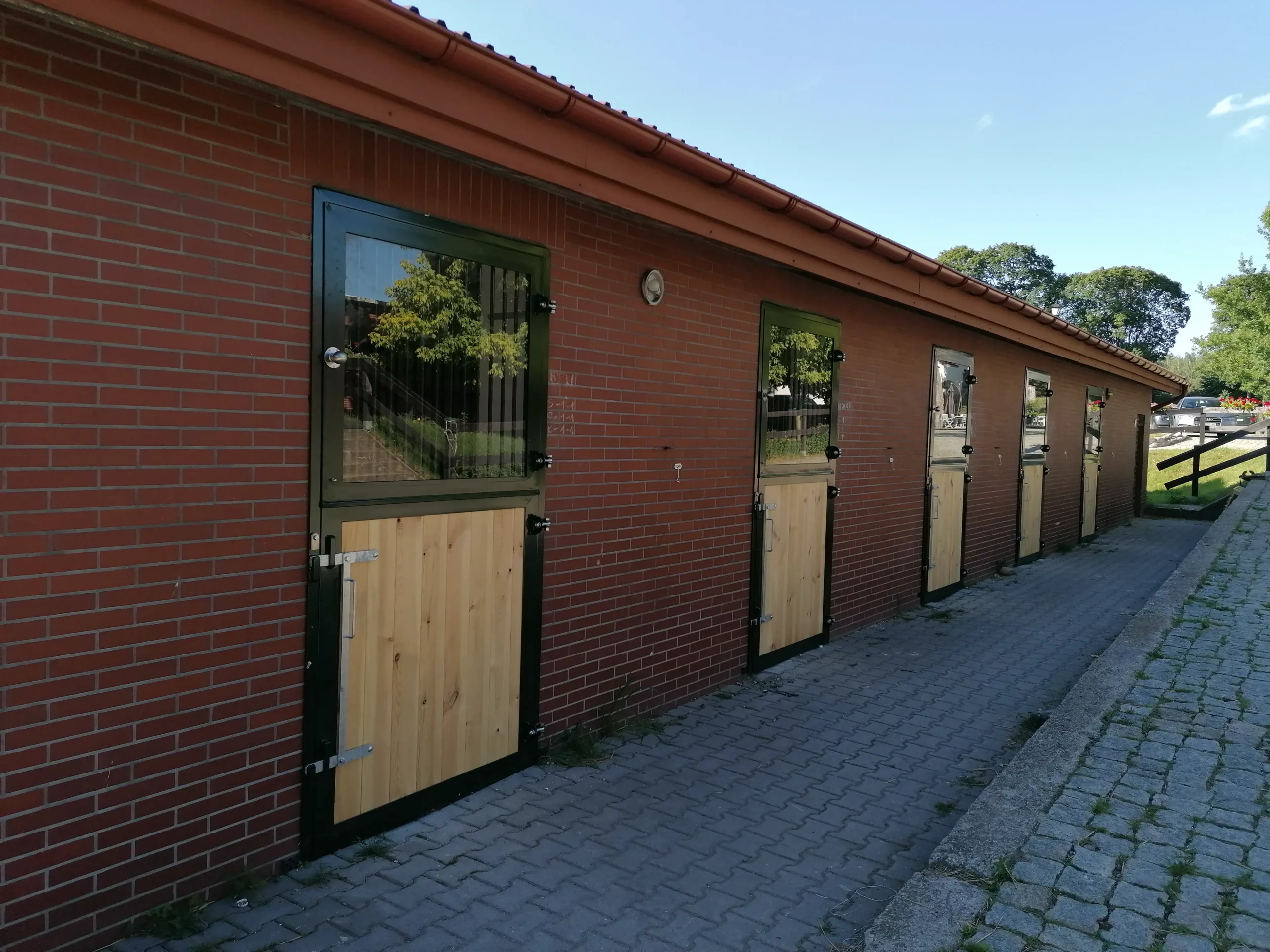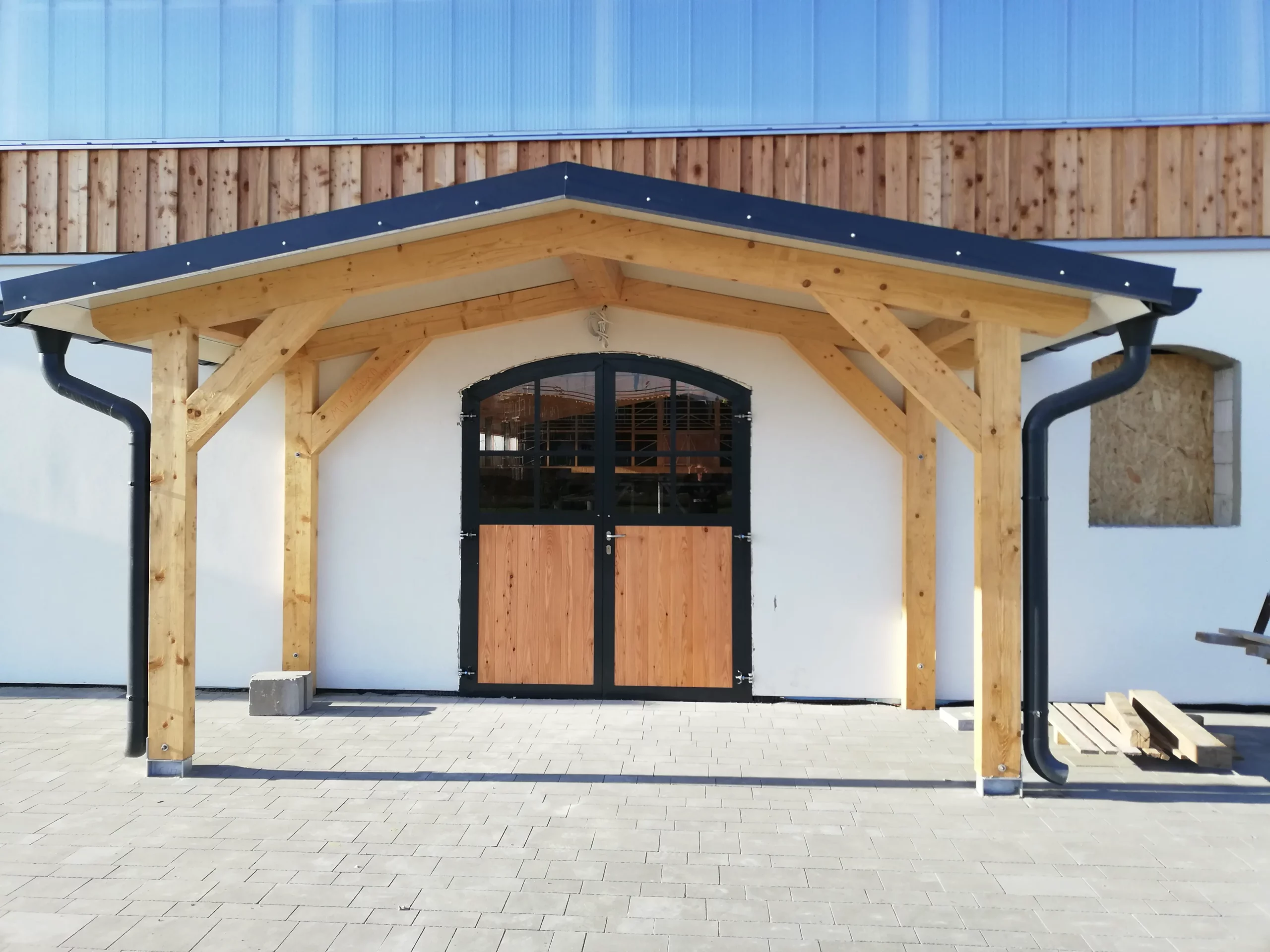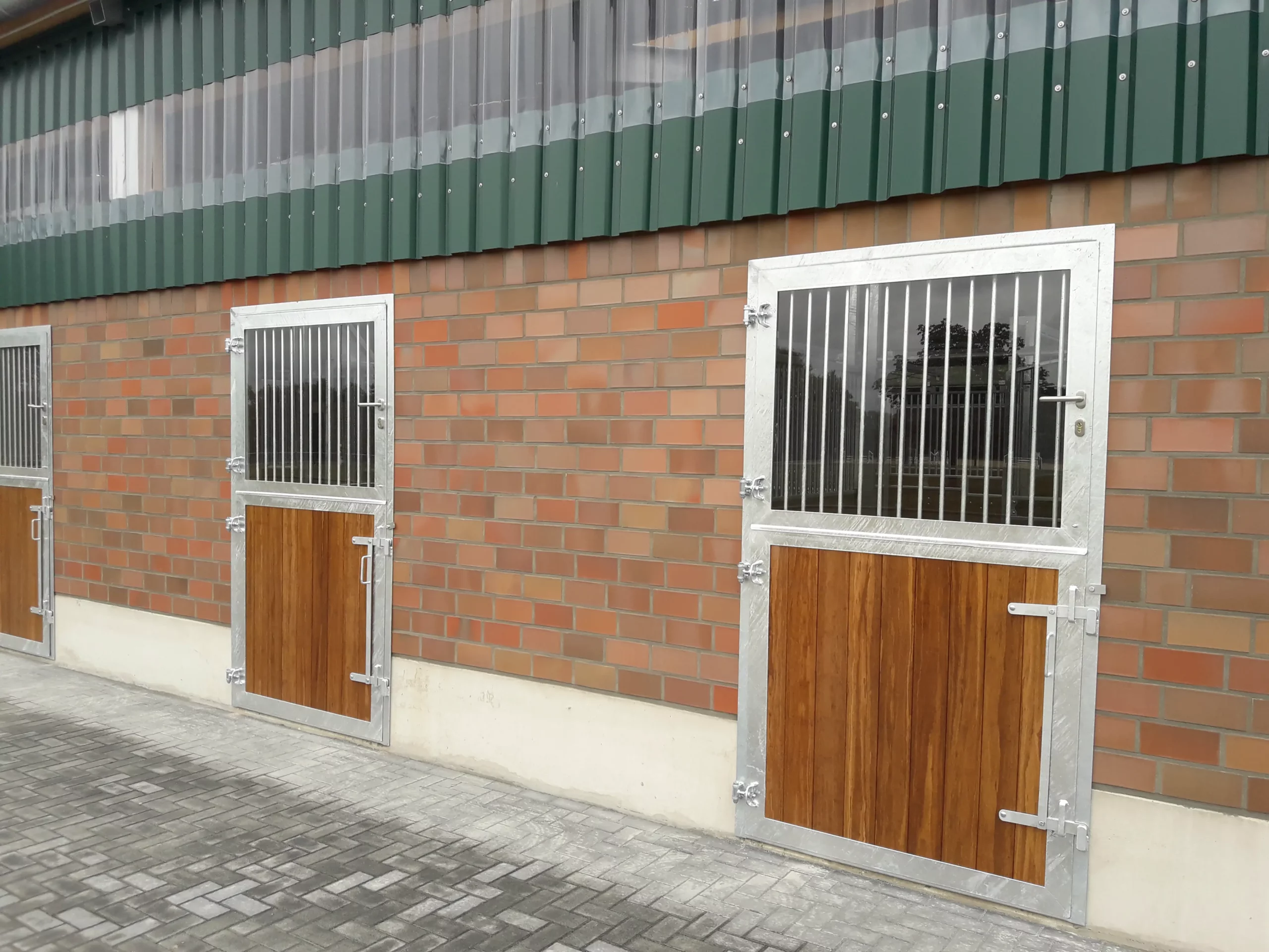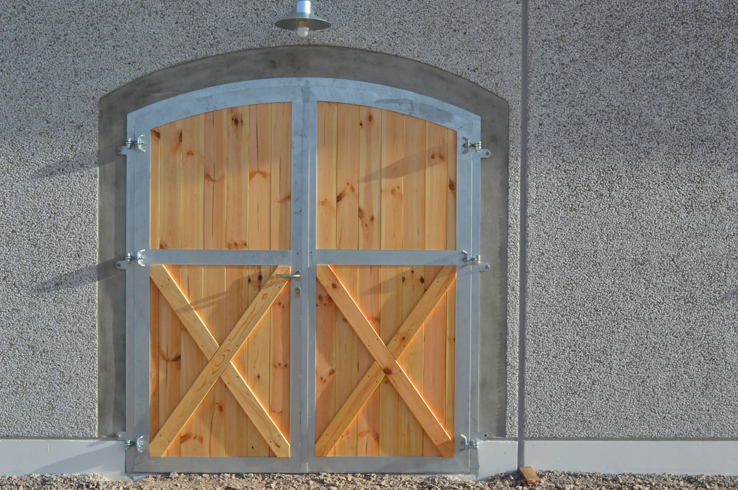 Drzwi dwuczęściowe, deski jesionowe zaimpregnowane, u góry szyba bezpieczna i krata, konstrukcja metalowa ocynkowana i malowana proszkowo.