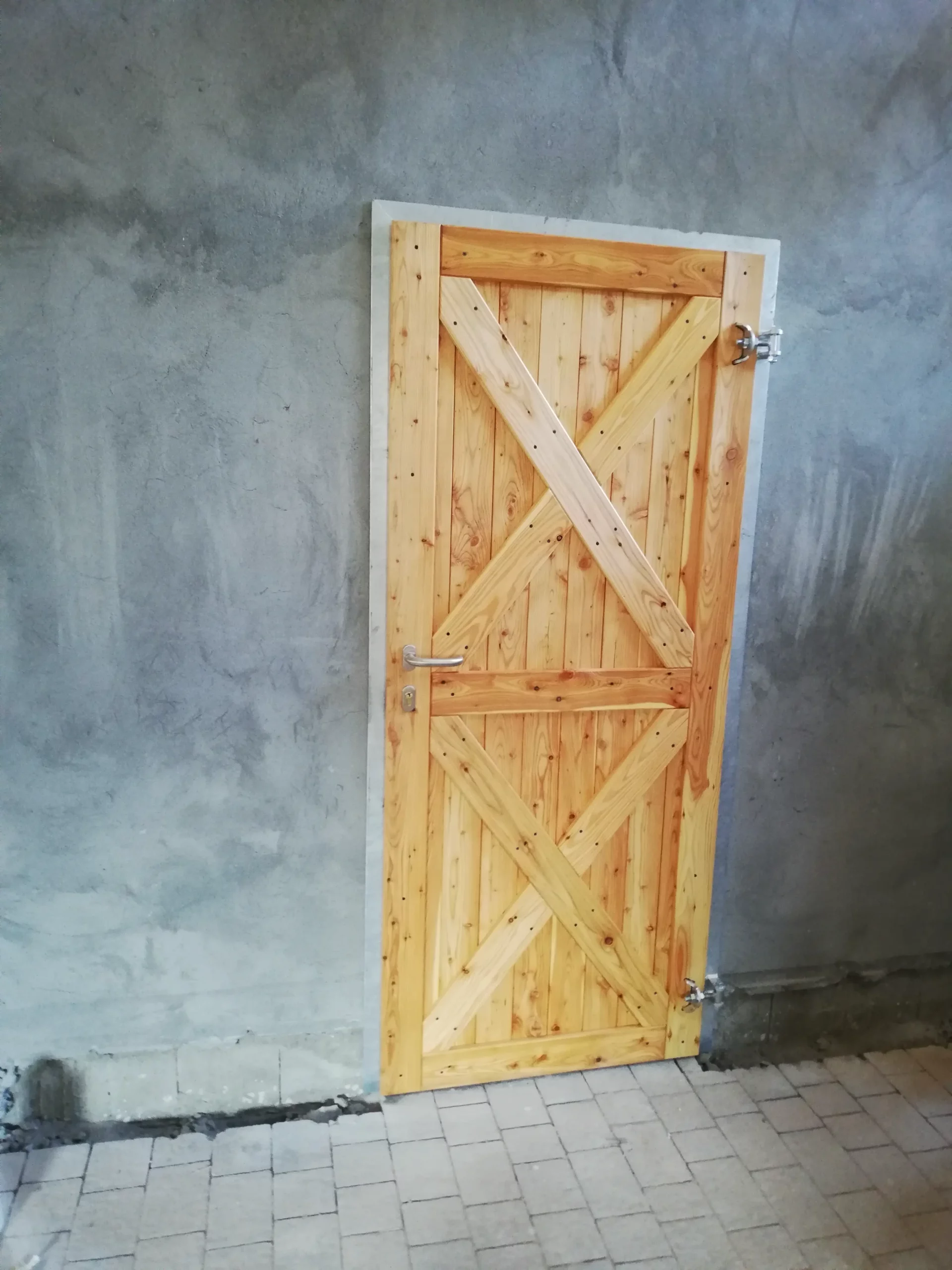 Drzwi jednoczęściowe, deski sosnowe impregnowane, konstrukcja metalowa ocynkowana, dodatkowe „x” ozdobne.