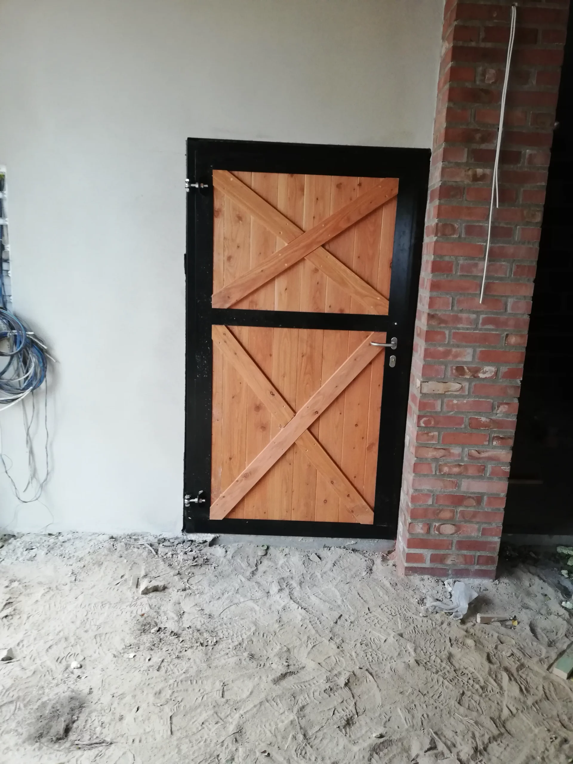 Drzwi jednoczęściowe, deski sosnowe malowane, konstrukcja metalowa ocynkowana i malowana proszkowo, dodatkowe „x” ozdobne.